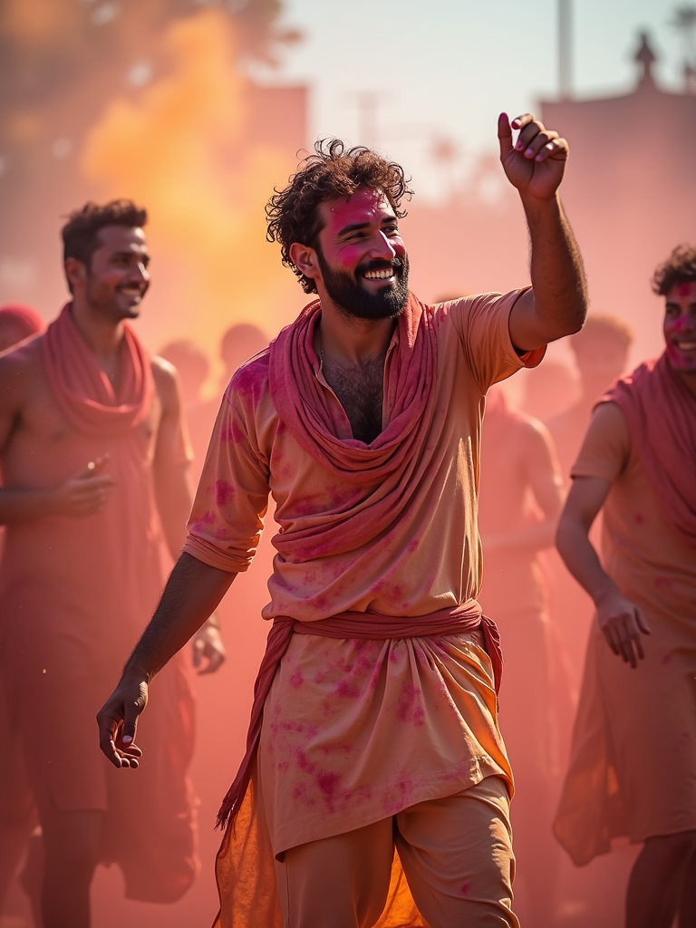 a model in traditional Indian attire splashed with Holi colors, dancing with fellow festival participants, capturing the energetic and playful atmosphere of the festival