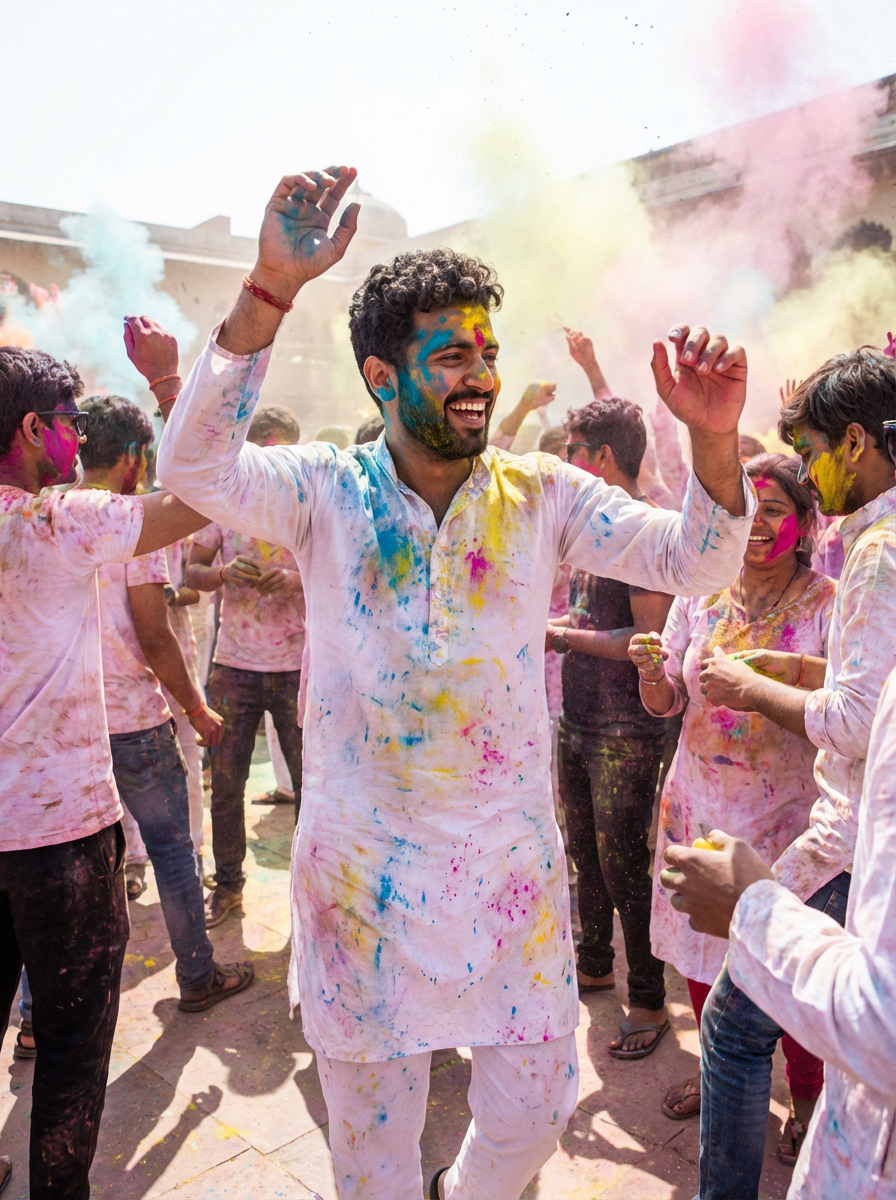 a model in traditional Indian attire splashed with Holi colors, dancing with fellow festival participants, capturing the energetic and playful atmosphere of the festival