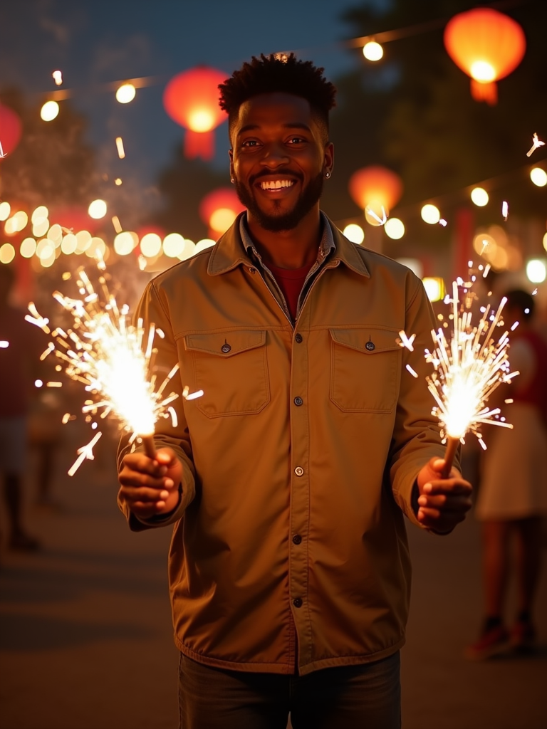 A model lighting sparklers outdoors in a vibrant setting with Diwali decorations like string lights and lanterns.