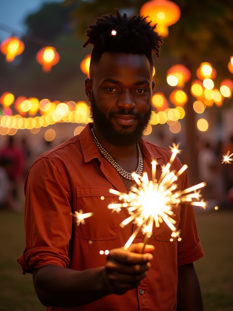 A model lighting sparklers outdoors in a vibrant setting with Diwali decorations like string lights and lanterns.