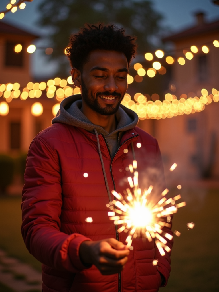 A model lighting sparklers outdoors in a vibrant setting with Diwali decorations like string lights and lanterns.
