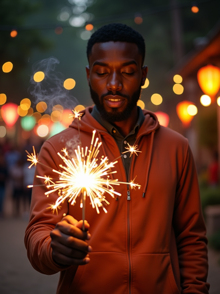 A model lighting sparklers outdoors in a vibrant setting with Diwali decorations like string lights and lanterns.