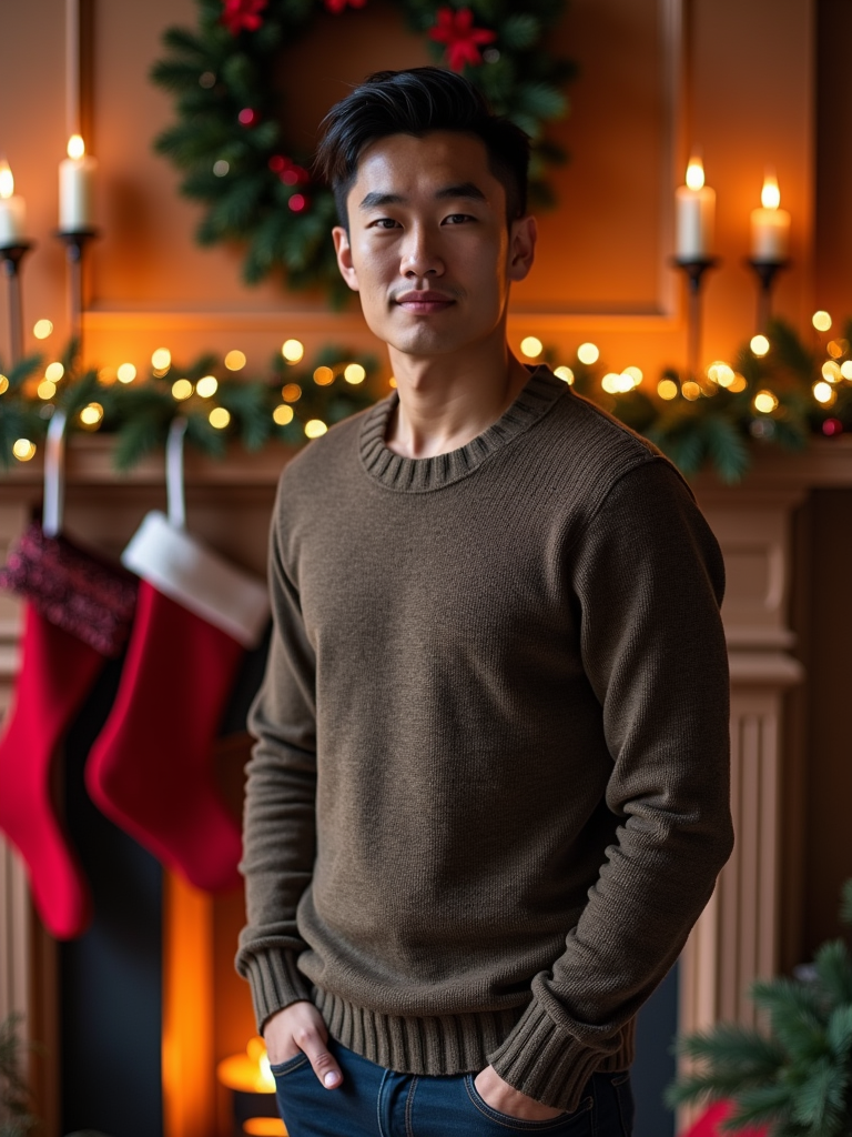 A model posing for a Christmas card photo, standing in front of a fireplace with stockings, garland, and holiday decorations.