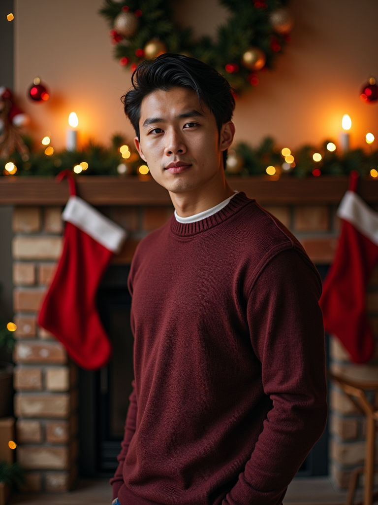 A model posing for a Christmas card photo, standing in front of a fireplace with stockings, garland, and holiday decorations.