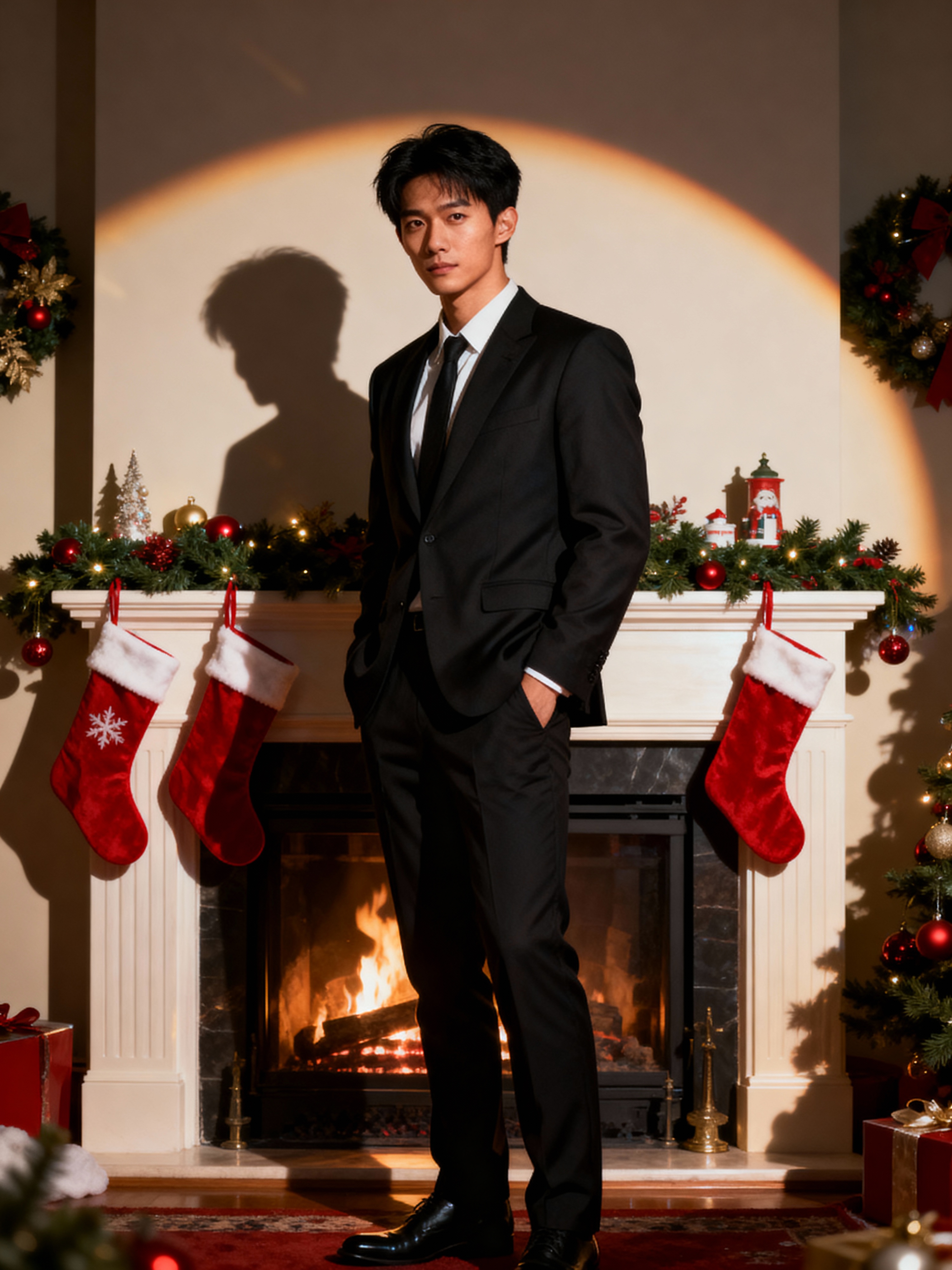 A model posing for a Christmas card photo, standing in front of a fireplace with stockings, garland, and holiday decorations.