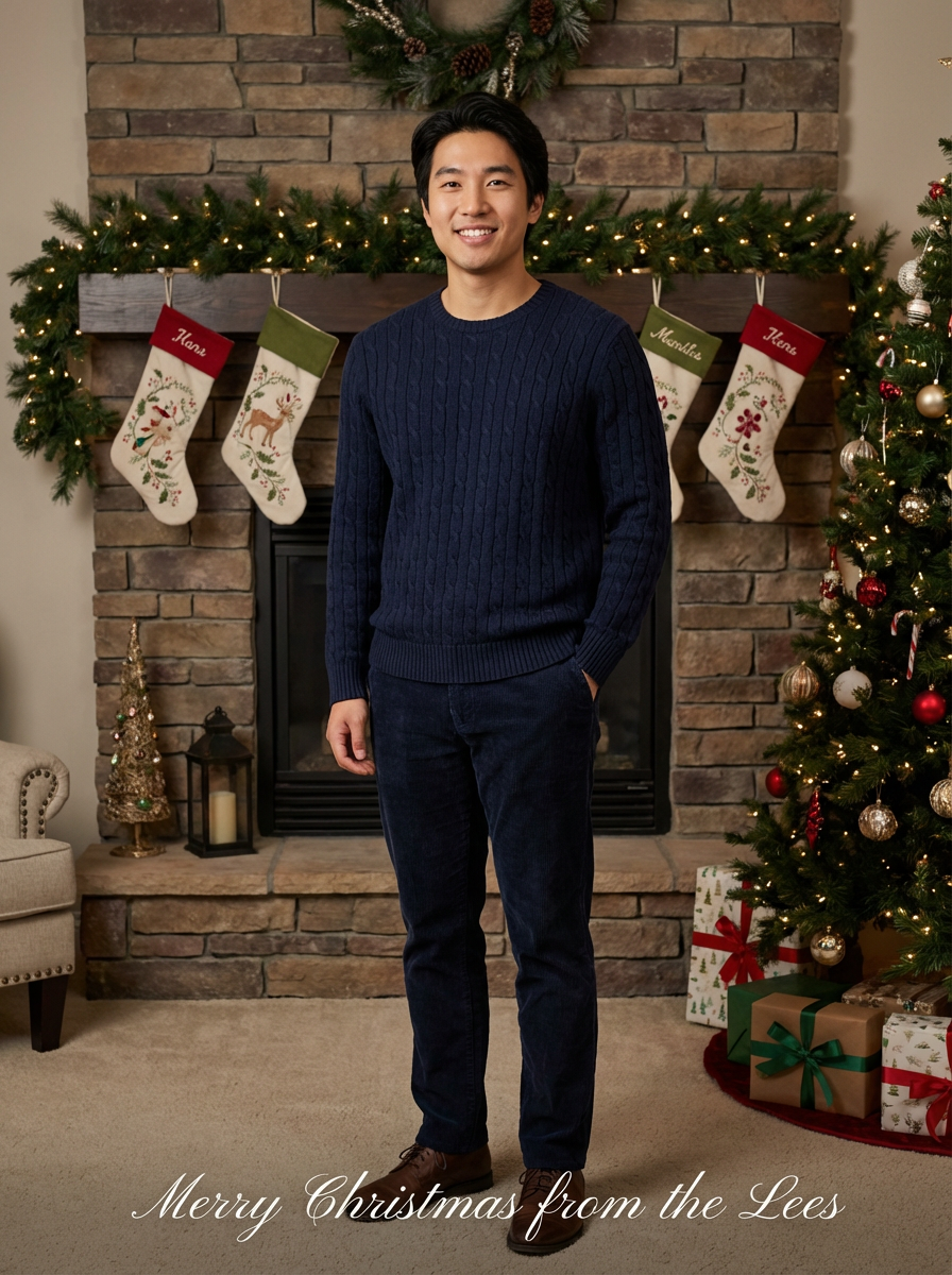 A model posing for a Christmas card photo, standing in front of a fireplace with stockings, garland, and holiday decorations.