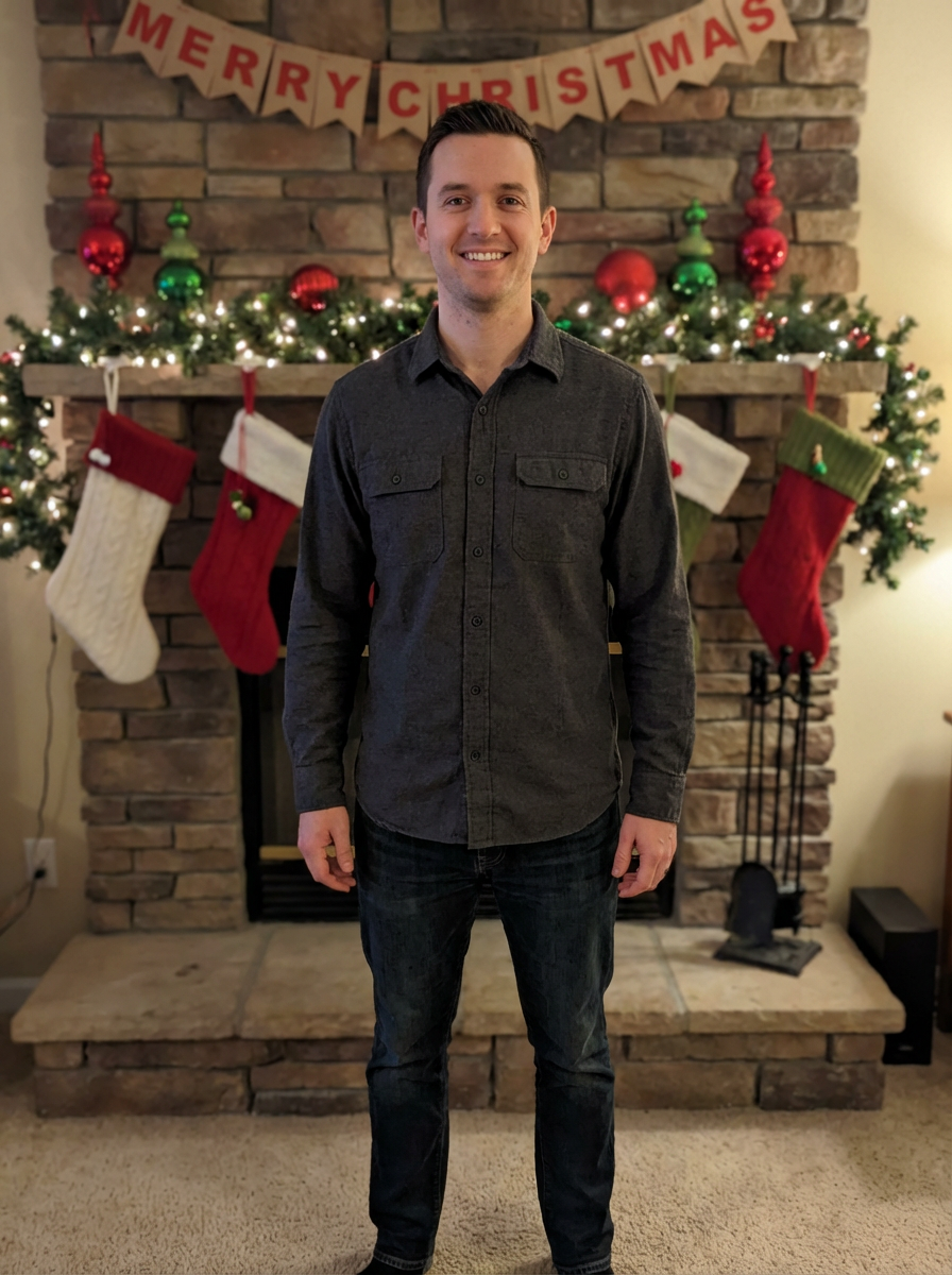 A model posing for a Christmas card photo, standing in front of a fireplace with stockings, garland, and holiday decorations.