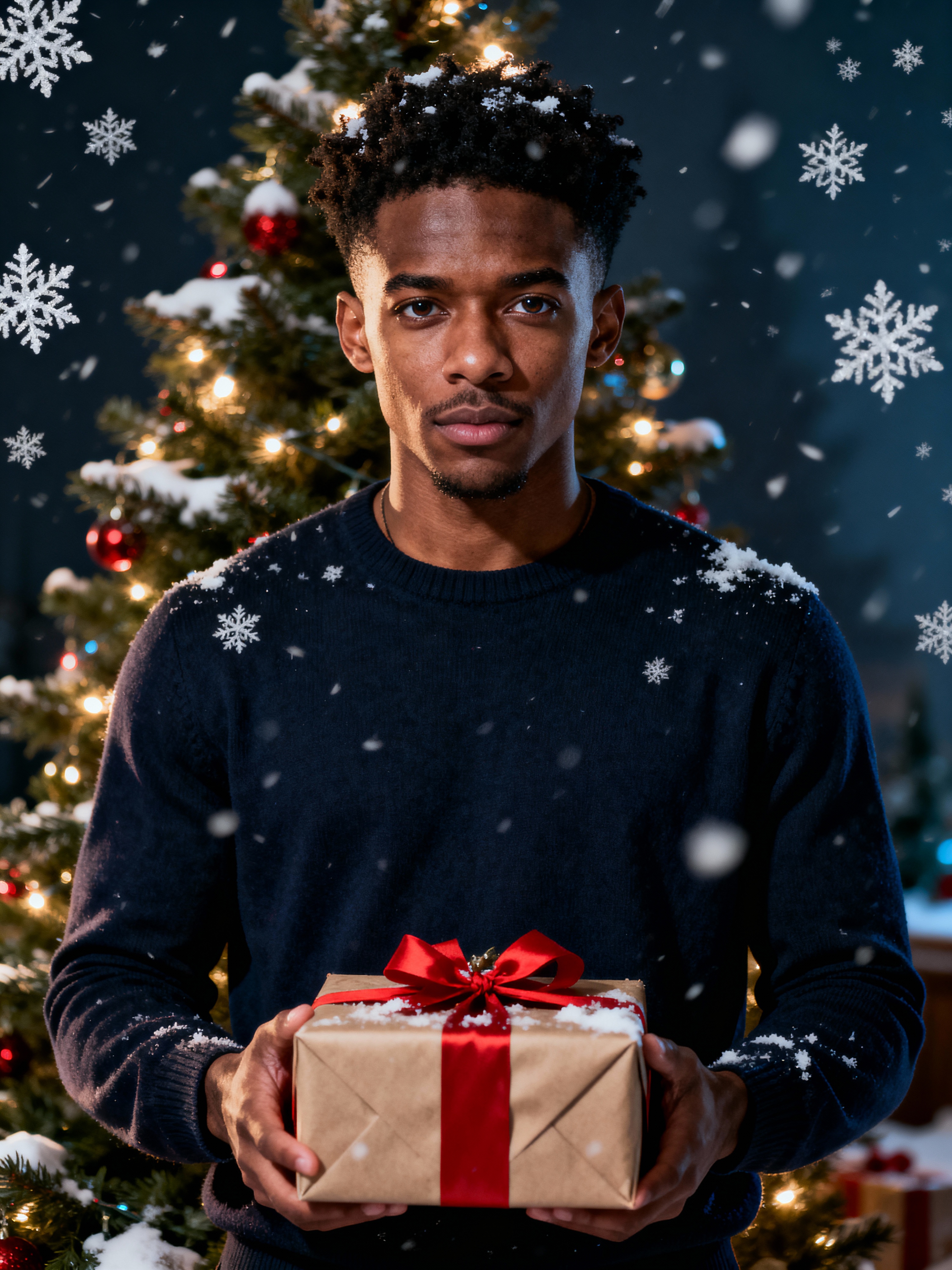 A model posing in front of a Christmas tree, holding presents, with snowflakes and festive lights in the background.