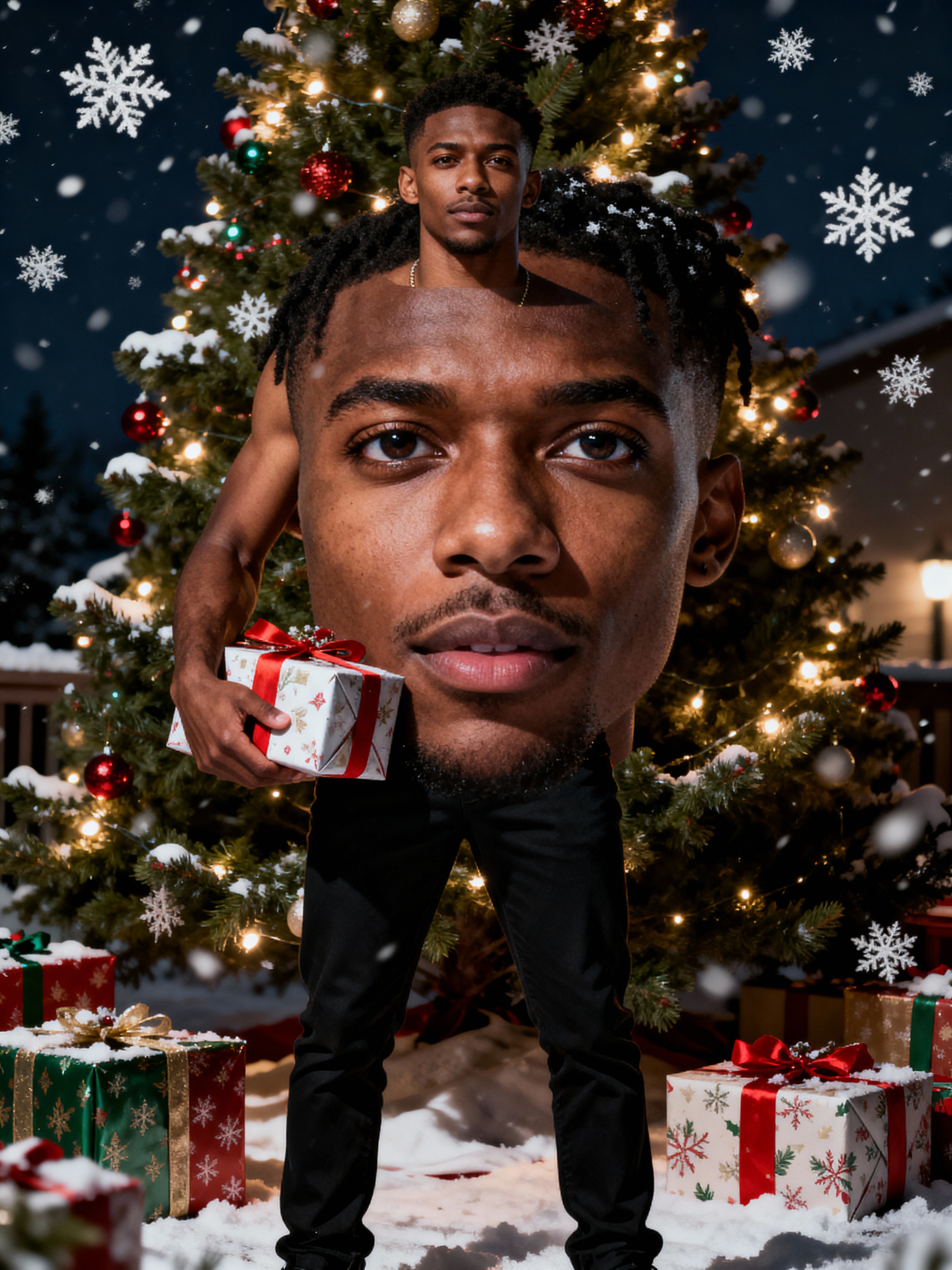 A model posing in front of a Christmas tree, holding presents, with snowflakes and festive lights in the background.