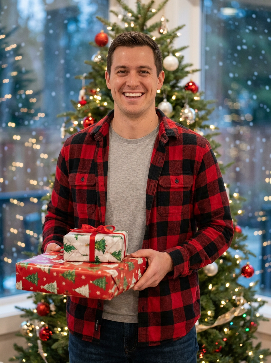 A model posing in front of a Christmas tree, holding presents, with snowflakes and festive lights in the background.