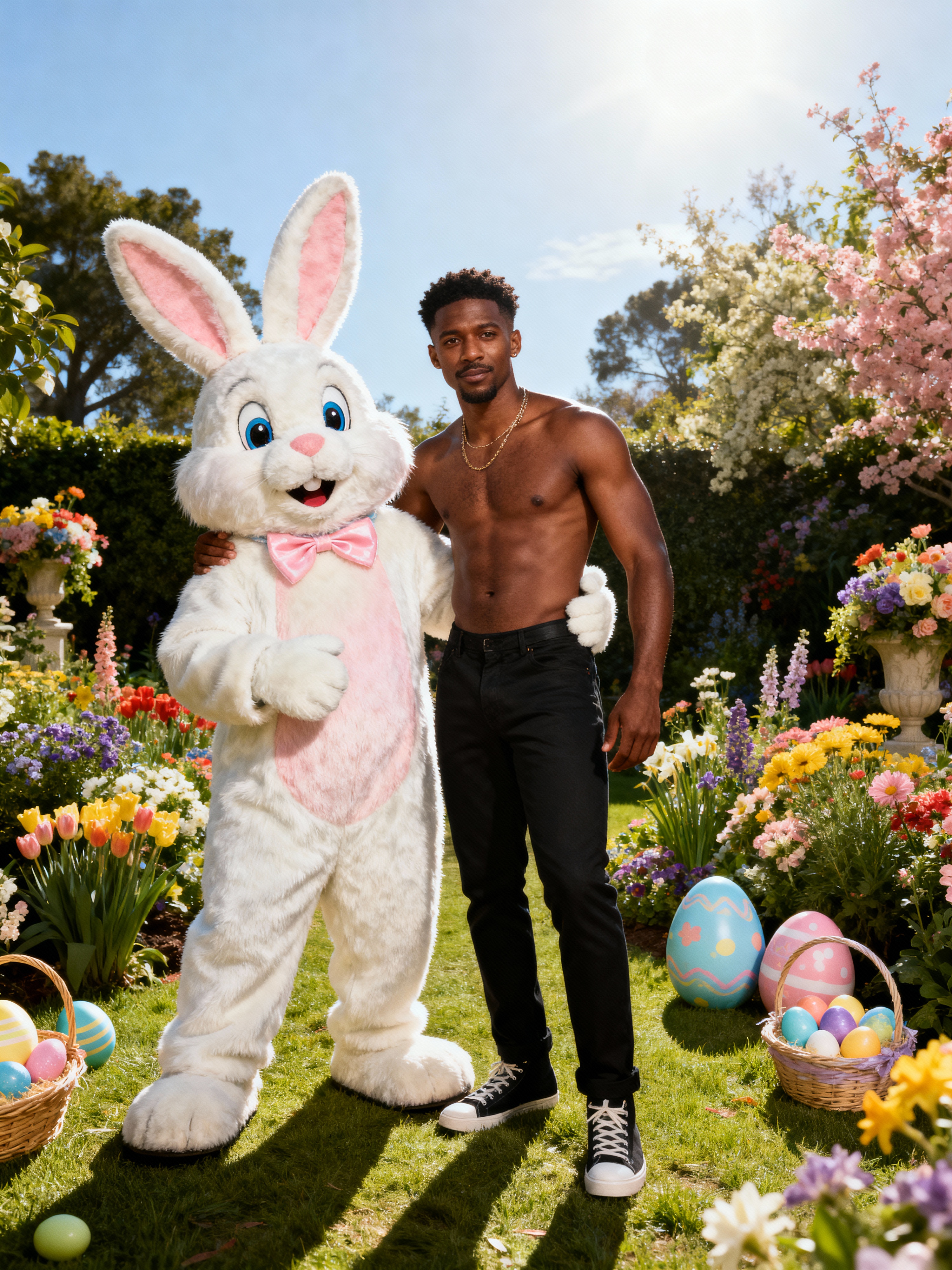 A model posing with an Easter bunny mascot in a garden full of flowers and decorated eggs.