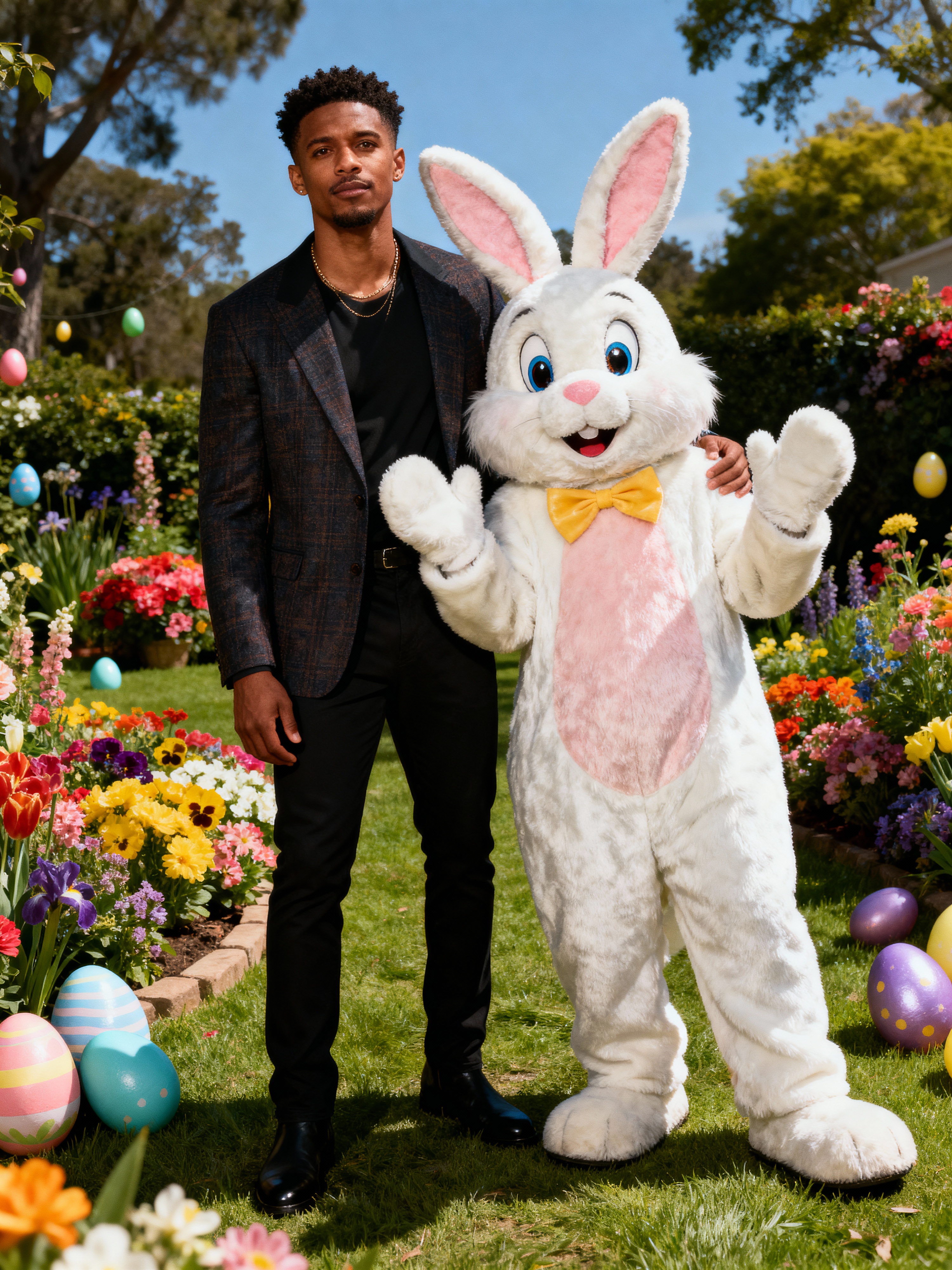 A model posing with an Easter bunny mascot in a garden full of flowers and decorated eggs.