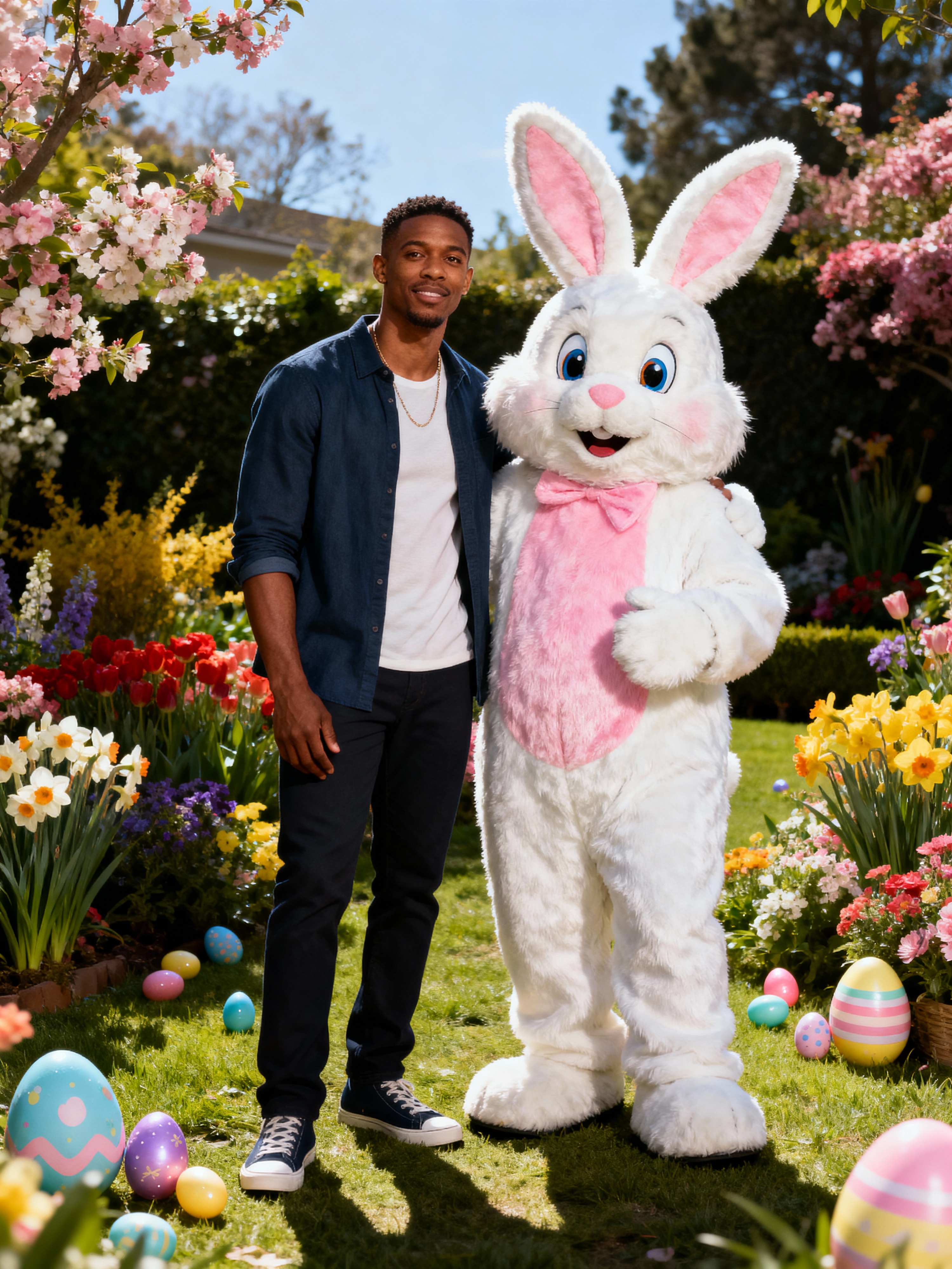 A model posing with an Easter bunny mascot in a garden full of flowers and decorated eggs.