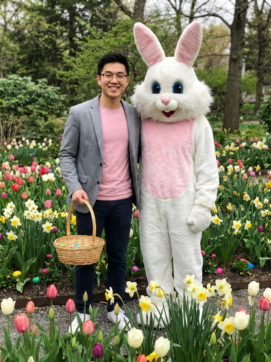 A model posing with an Easter bunny mascot in a garden full of flowers and decorated eggs.
