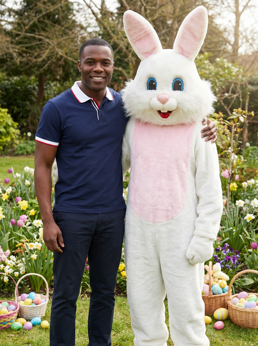 A model posing with an Easter bunny mascot in a garden full of flowers and decorated eggs.