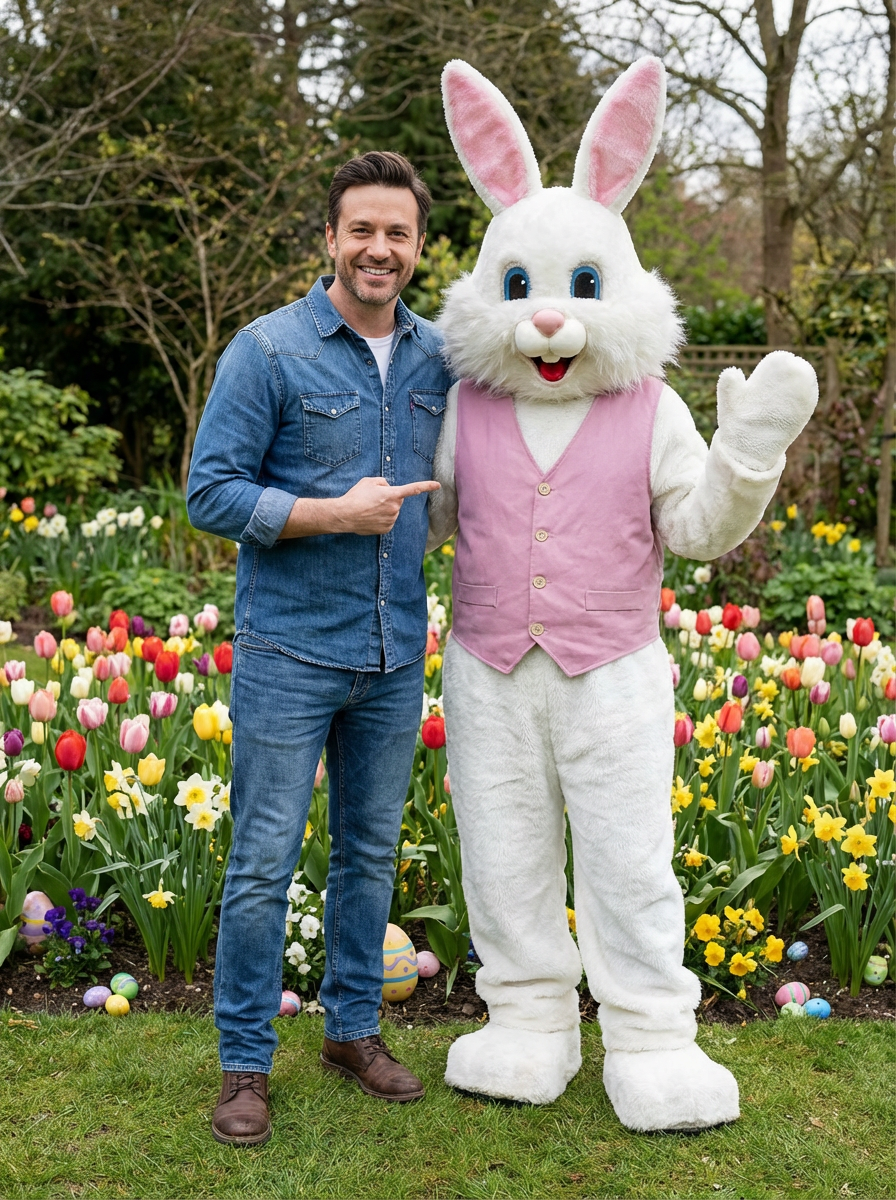 A model posing with an Easter bunny mascot in a garden full of flowers and decorated eggs.