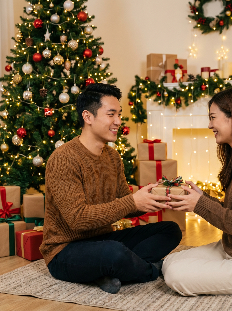 A model sitting together by a decorated Christmas tree, exchanging gifts with festive lights and ornaments in the background.
