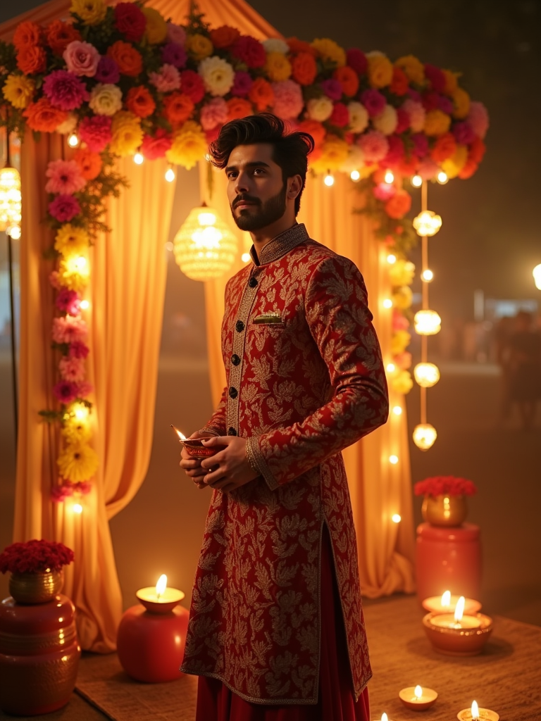 A model standing near a beautifully decorated Diwali backdrop with hanging lights, flowers, and diyas, exuding the festive spirit in a traditional dress.