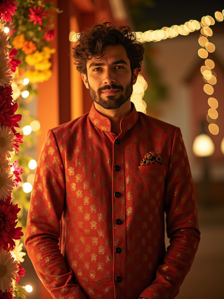A model standing near a beautifully decorated Diwali backdrop with hanging lights, flowers, and diyas, exuding the festive spirit in a traditional dress.