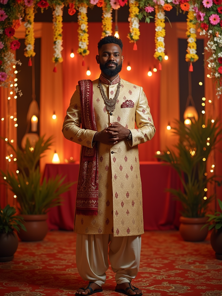 A model standing near a beautifully decorated Diwali backdrop with hanging lights, flowers, and diyas, exuding the festive spirit in a traditional dress.
