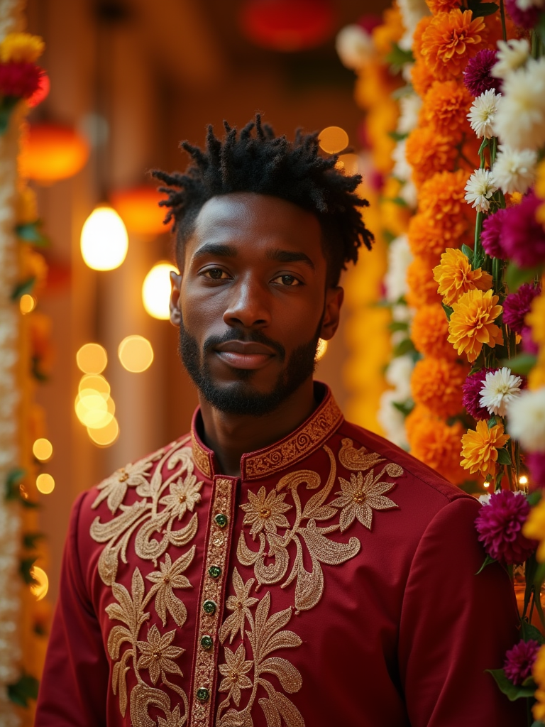 A model standing near a beautifully decorated Diwali backdrop with hanging lights, flowers, and diyas, exuding the festive spirit in a traditional dress.