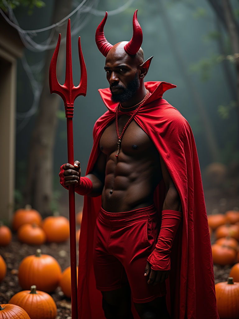 A model wearing a classic red devil costume with devil horns, a red cape, and holding a trident. The backdrop includes pumpkins, spider webs, and a spooky night scene.