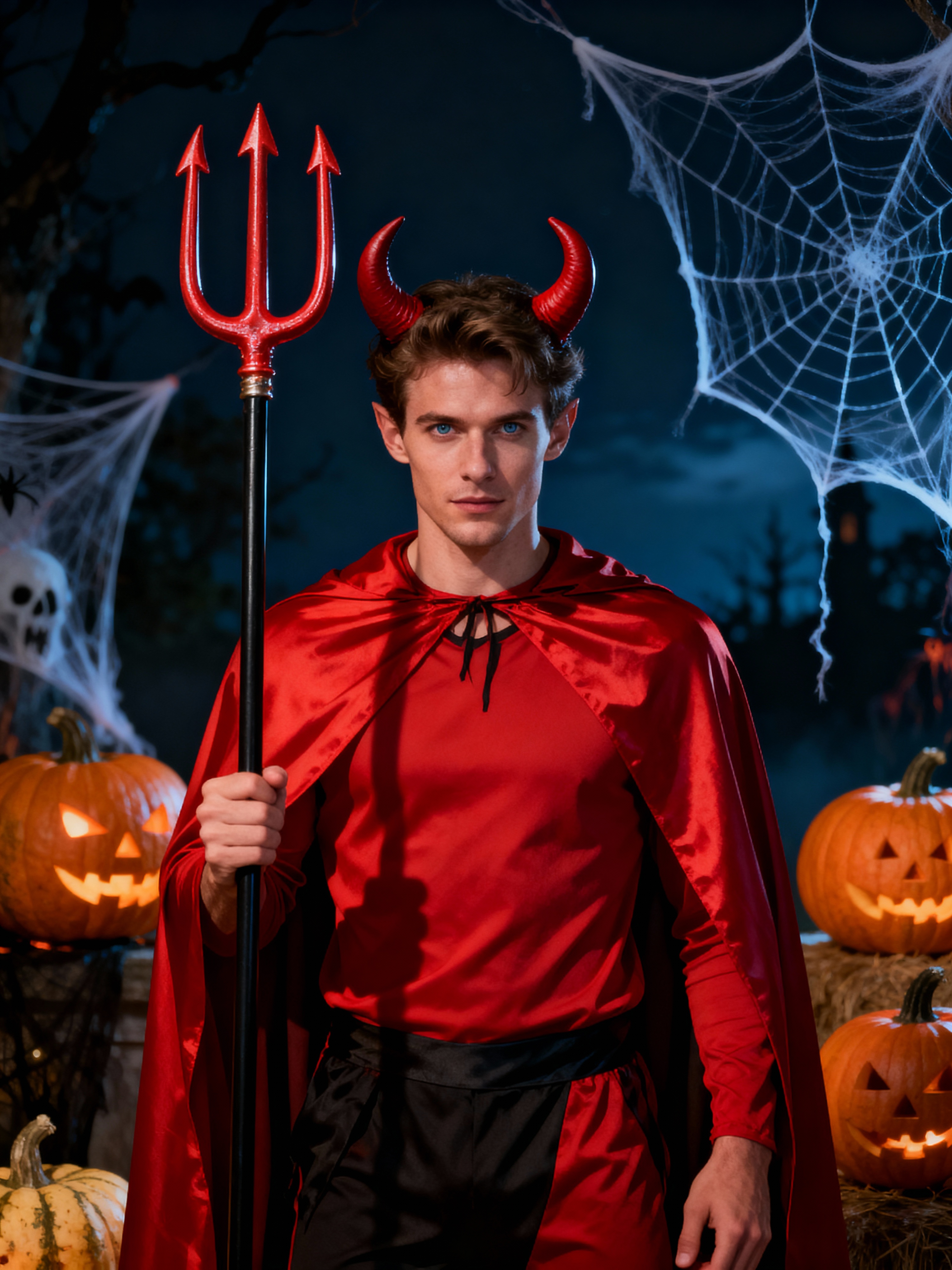 A model wearing a classic red devil costume with devil horns, a red cape, and holding a trident. The backdrop includes pumpkins, spider webs, and a spooky night scene.