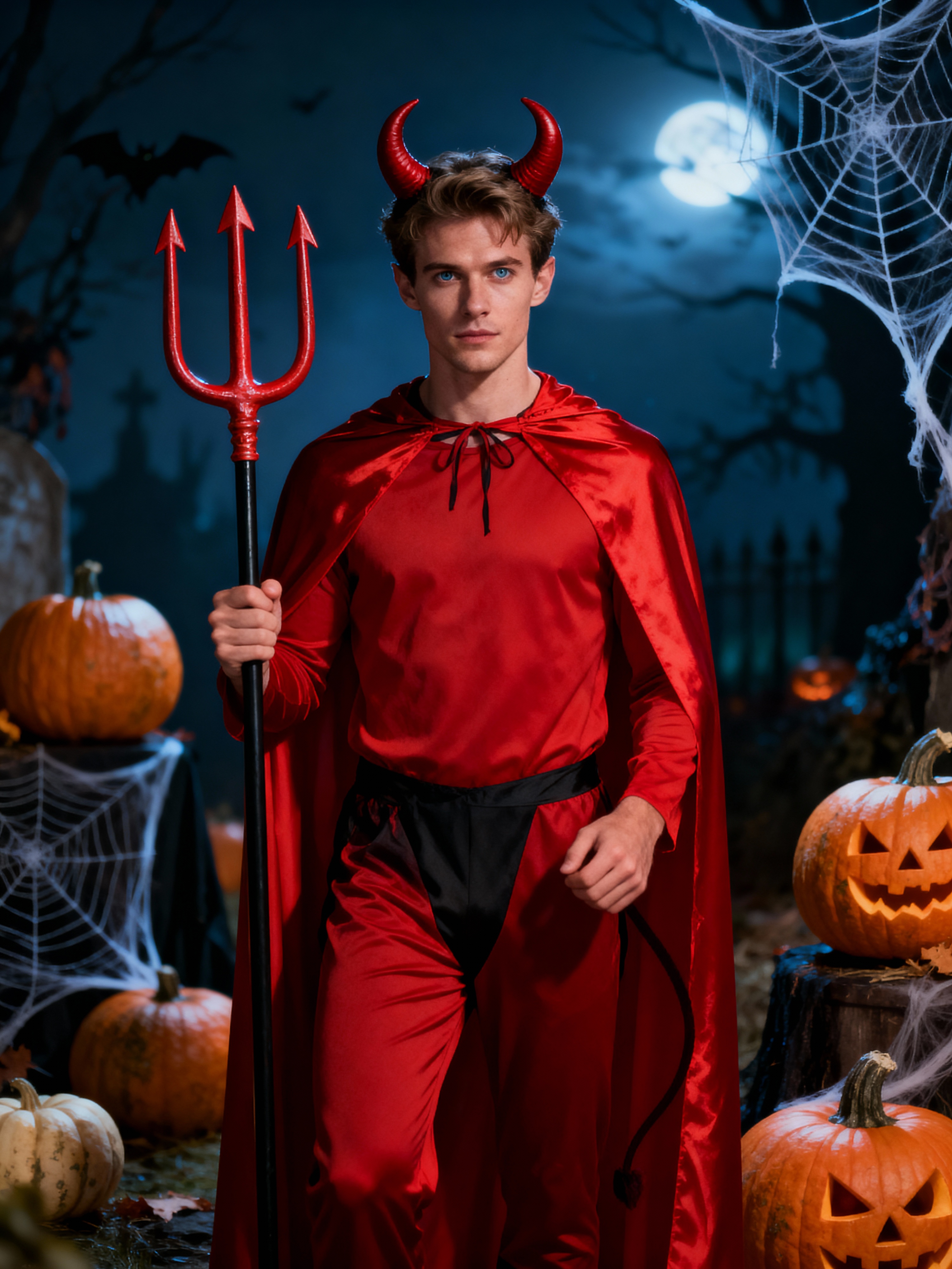 A model wearing a classic red devil costume with devil horns, a red cape, and holding a trident. The backdrop includes pumpkins, spider webs, and a spooky night scene.