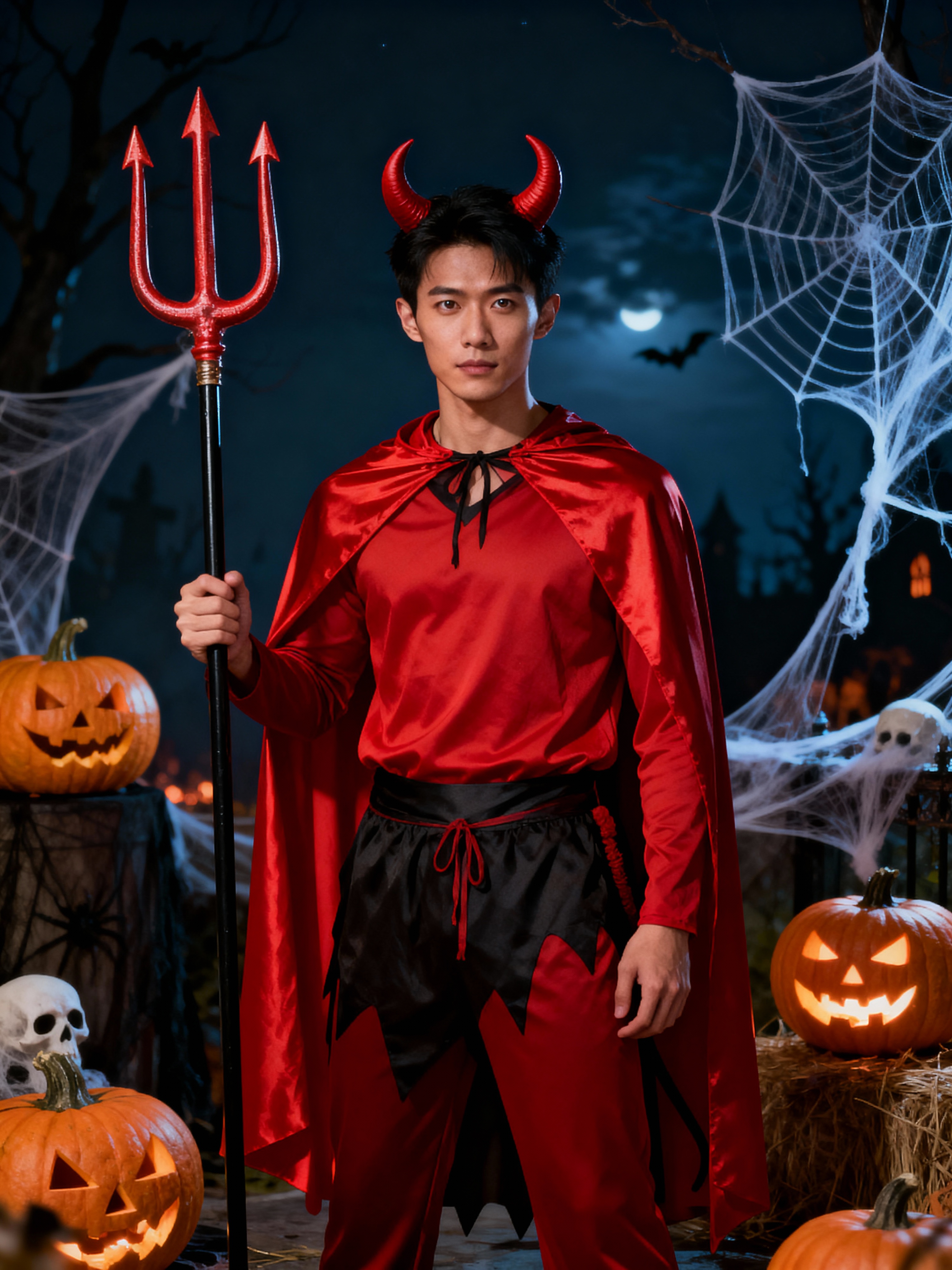 A model wearing a classic red devil costume with devil horns, a red cape, and holding a trident. The backdrop includes pumpkins, spider webs, and a spooky night scene.
