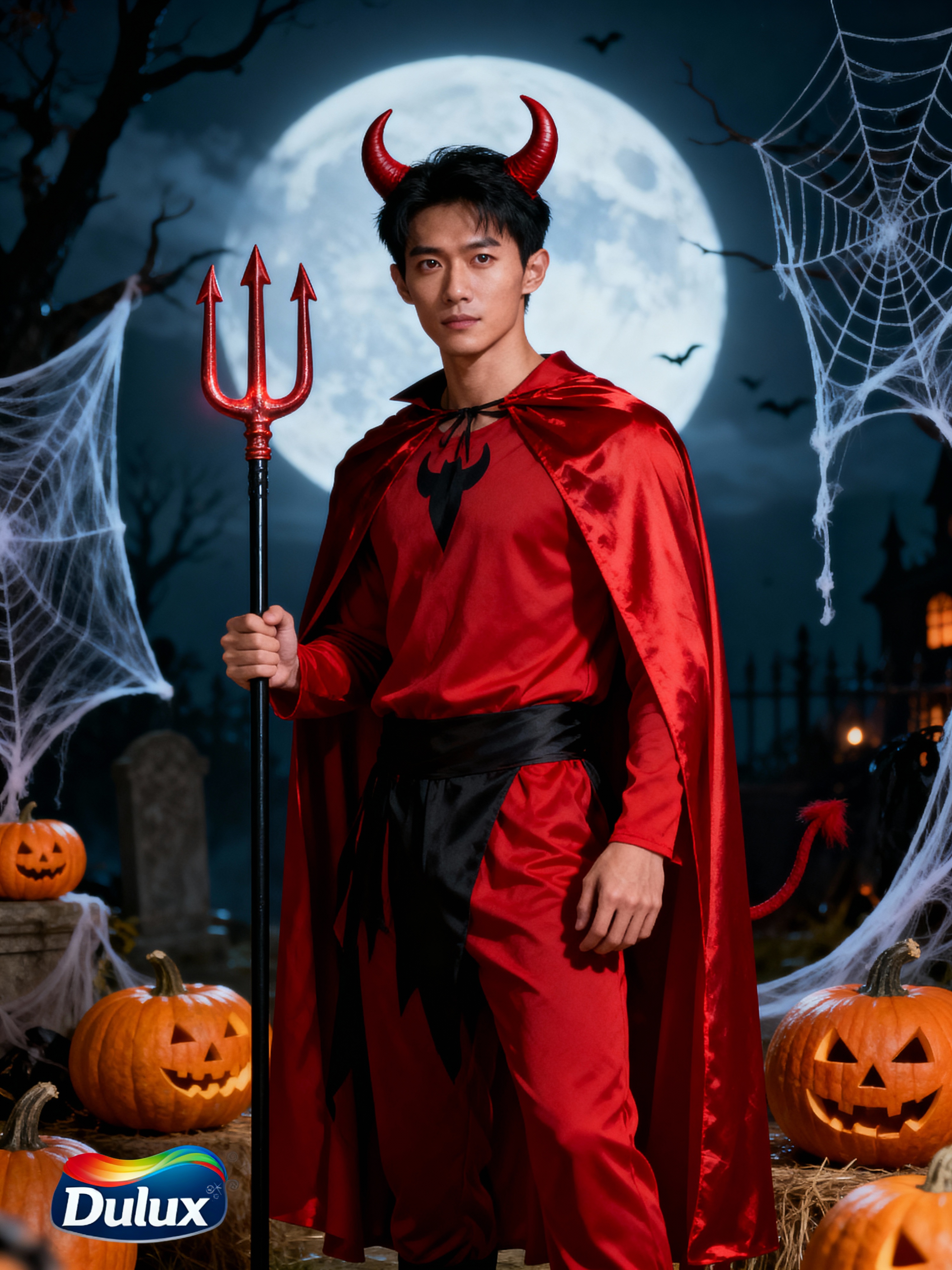 A model wearing a classic red devil costume with devil horns, a red cape, and holding a trident. The backdrop includes pumpkins, spider webs, and a spooky night scene.