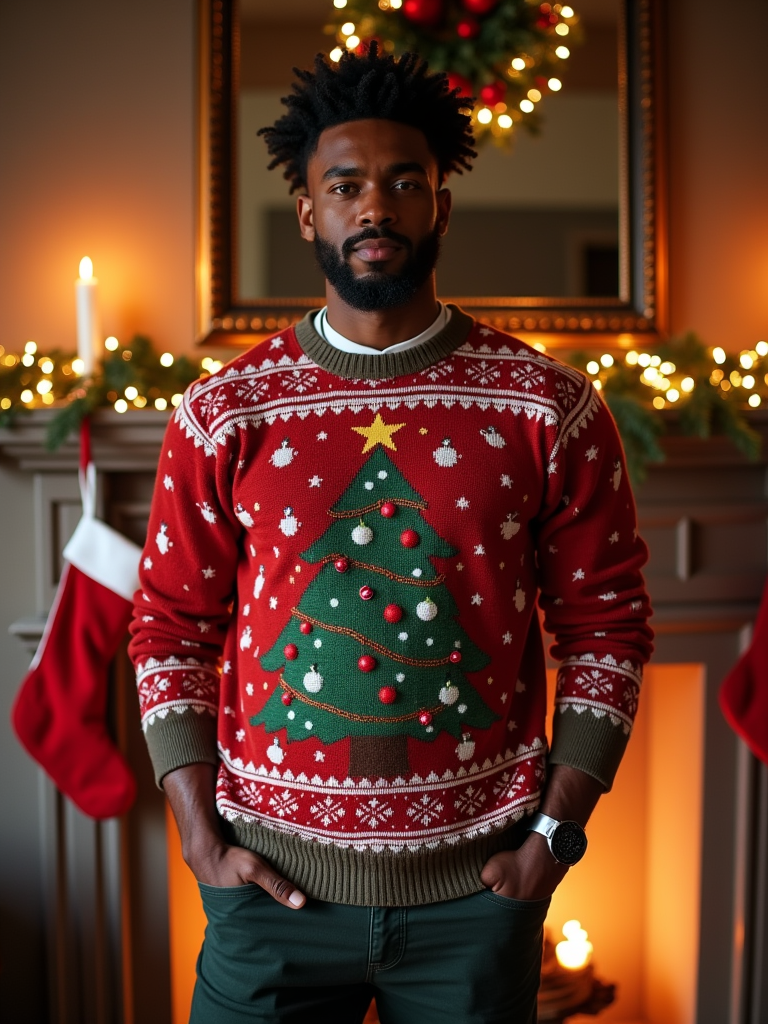 A model wearing a cozy Christmas sweater, standing by the fireplace with stockings and holiday decorations.