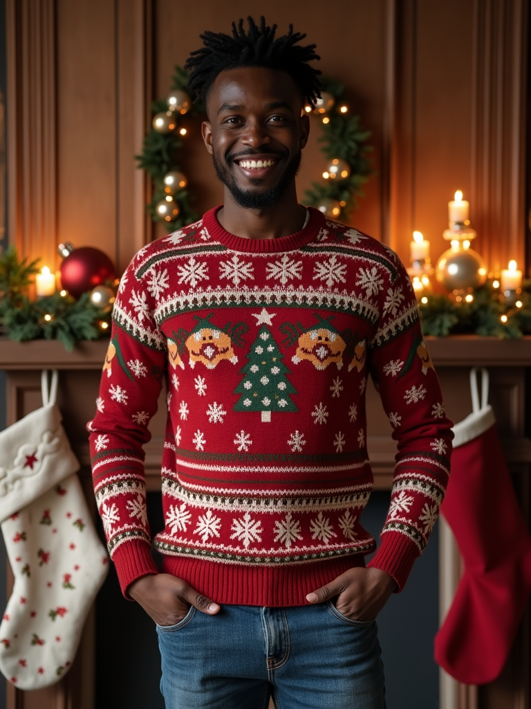 A model wearing a cozy Christmas sweater, standing by the fireplace with stockings and holiday decorations.