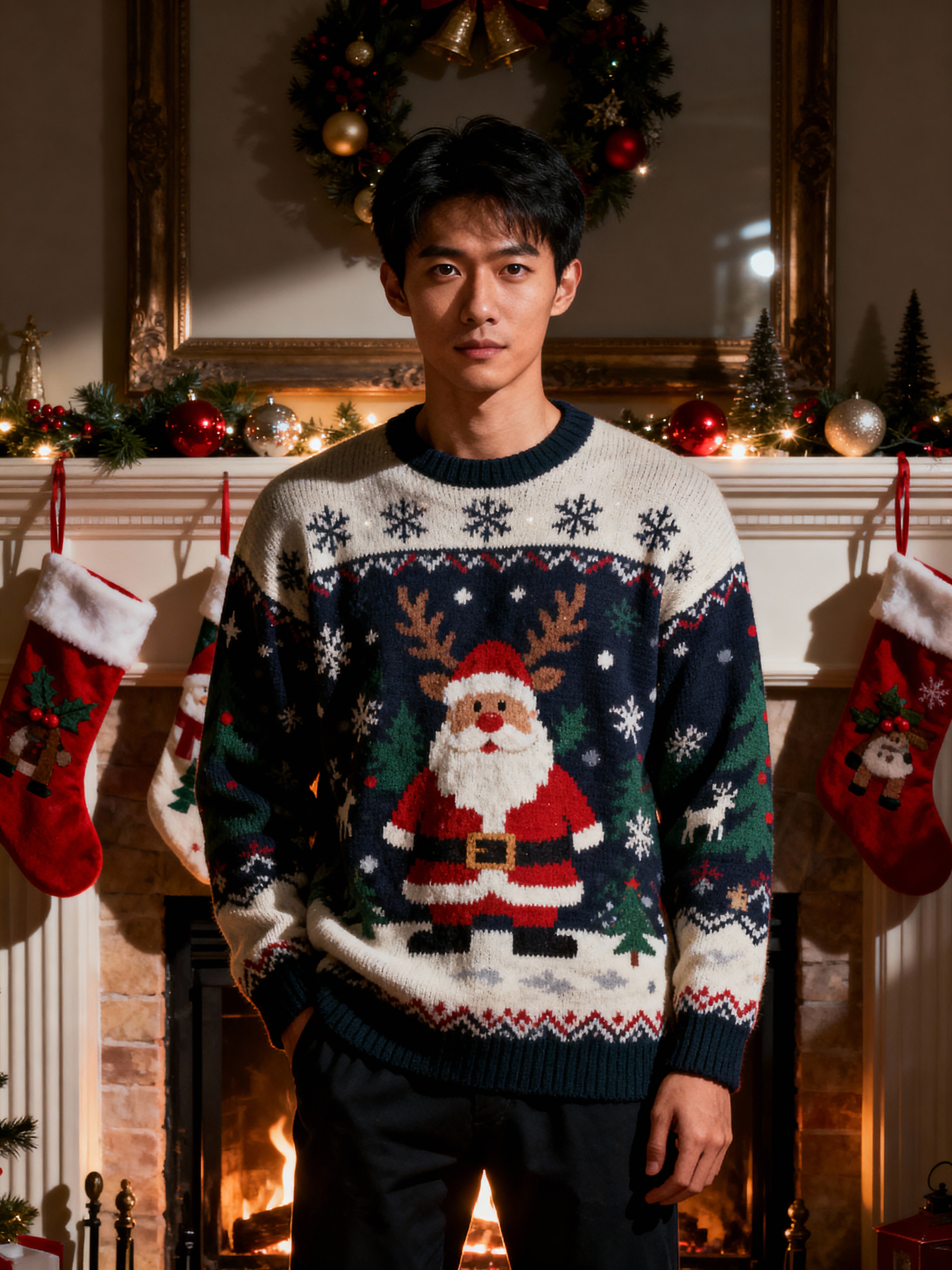 A model wearing a cozy Christmas sweater, standing by the fireplace with stockings and holiday decorations.