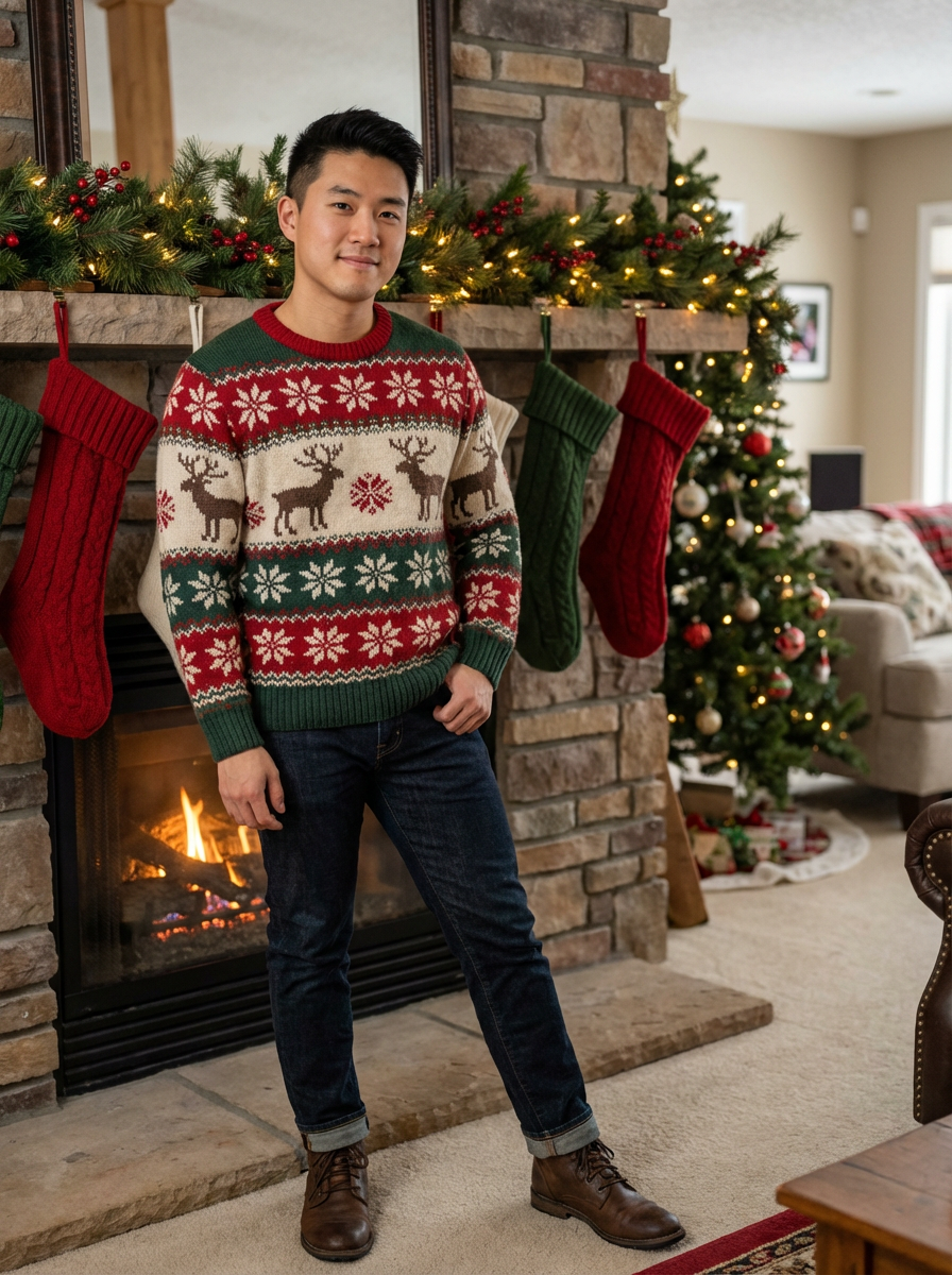 A model wearing a cozy Christmas sweater, standing by the fireplace with stockings and holiday decorations.