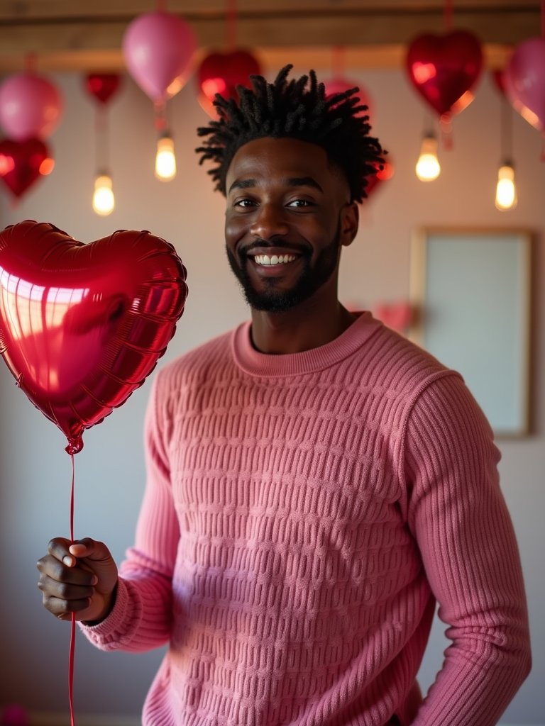 A model wearing a cute, pink Valentine's Day sweater, holding a heart-shaped balloon in a room filled with romantic decorations.