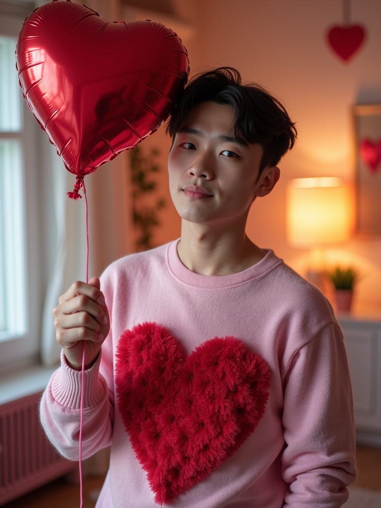 A model wearing a cute, pink Valentine's Day sweater, holding a heart-shaped balloon in a room filled with romantic decorations.