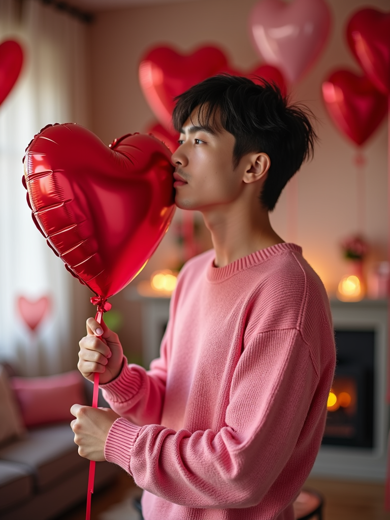 A model wearing a cute, pink Valentine's Day sweater, holding a heart-shaped balloon in a room filled with romantic decorations.