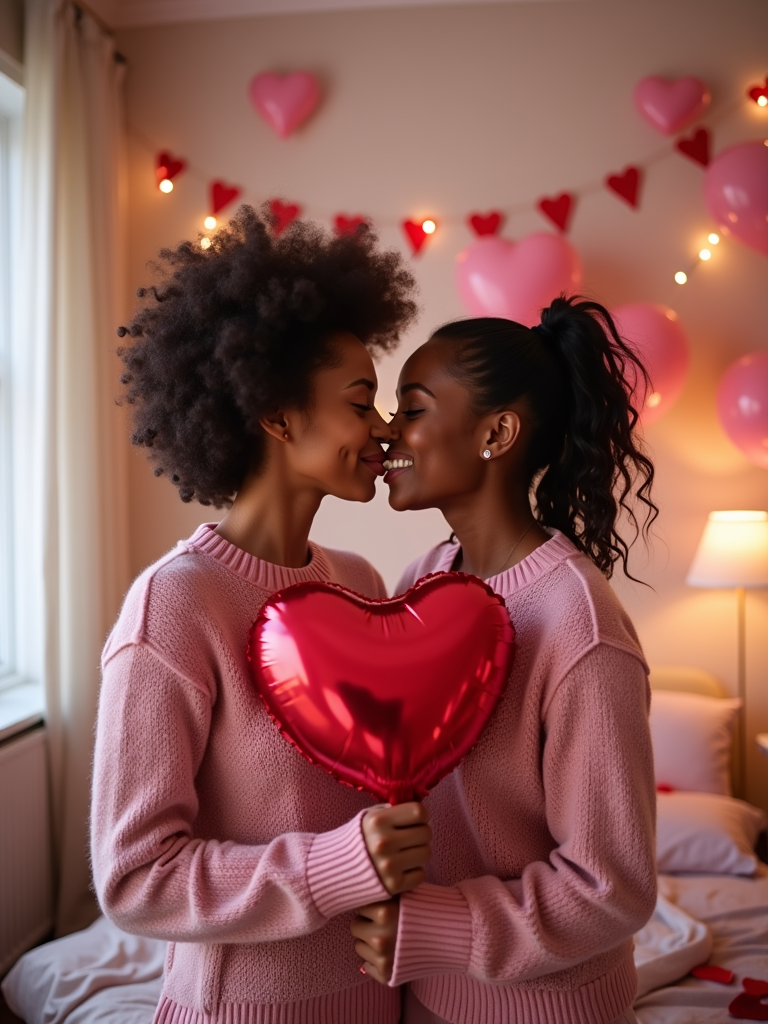 a model wearing a cute, pink valentine's day sweater, holding a heart-shaped balloon in a room filled with romantic decorations.