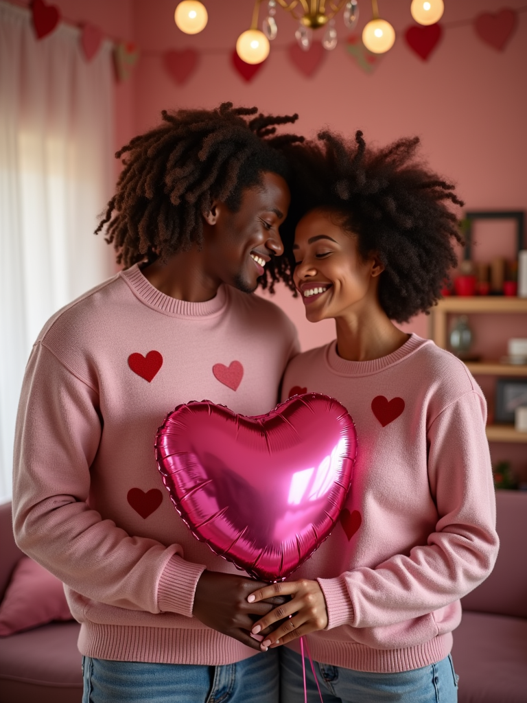 a model wearing a cute, pink valentine's day sweater, holding a heart-shaped balloon in a room filled with romantic decorations.