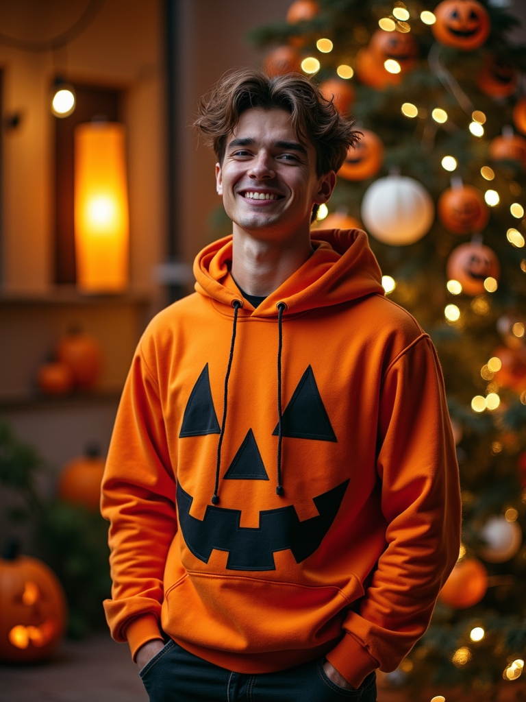 A model wearing a pumpkin-themed costume, standing beside a decorated Halloween tree and festive lanterns.