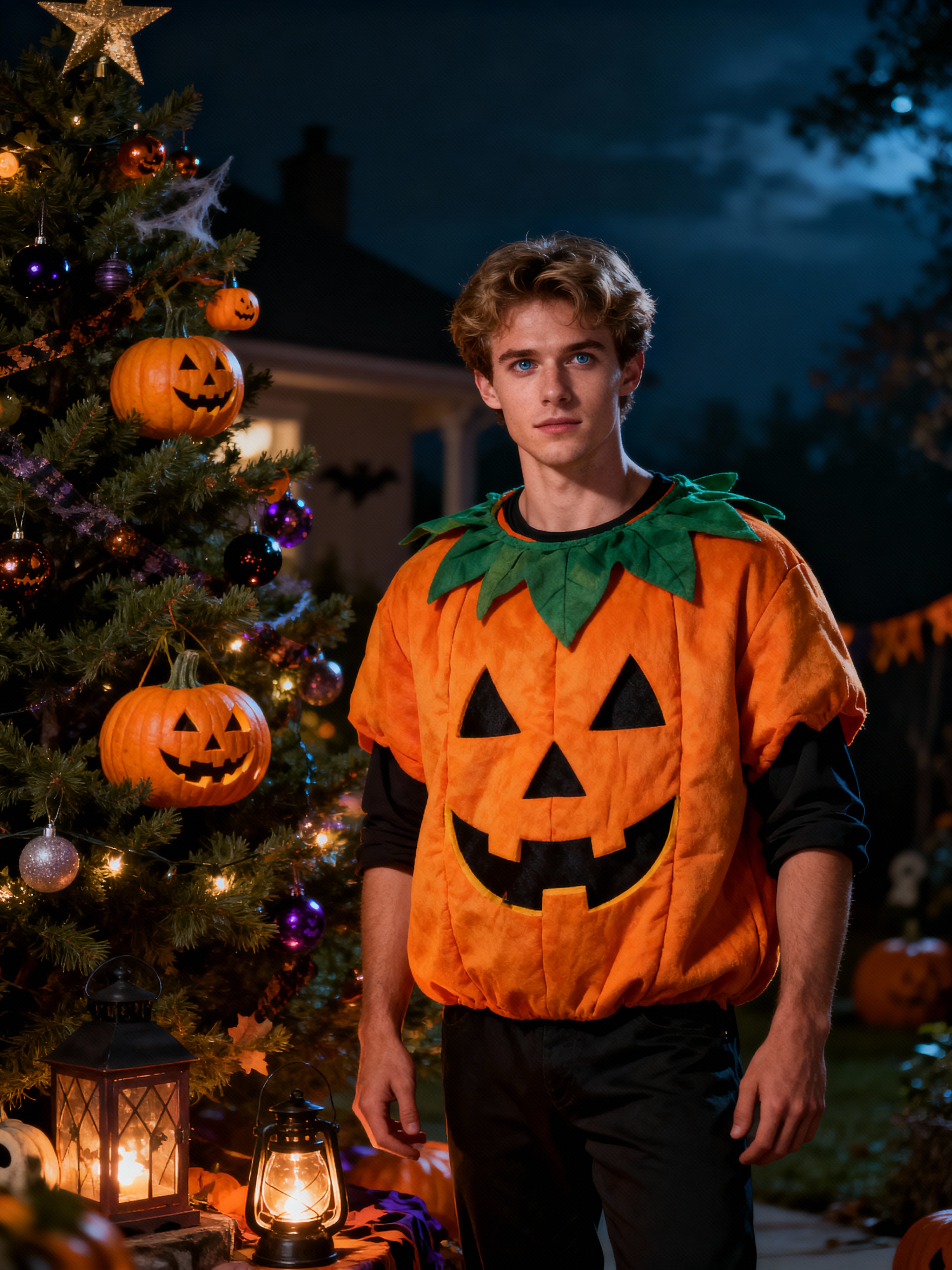 A model wearing a pumpkin-themed costume, standing beside a decorated Halloween tree and festive lanterns.