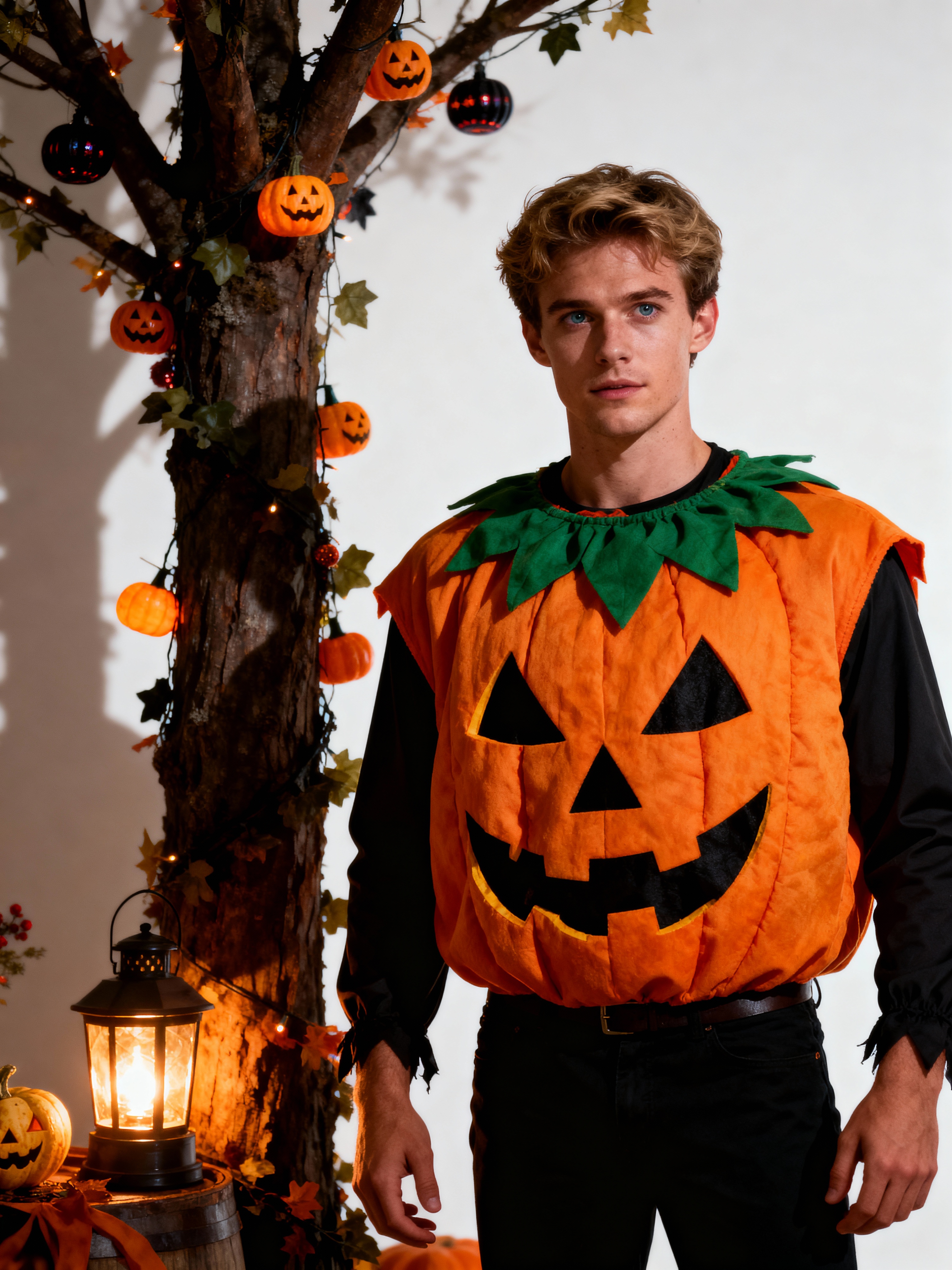 A model wearing a pumpkin-themed costume, standing beside a decorated Halloween tree and festive lanterns.