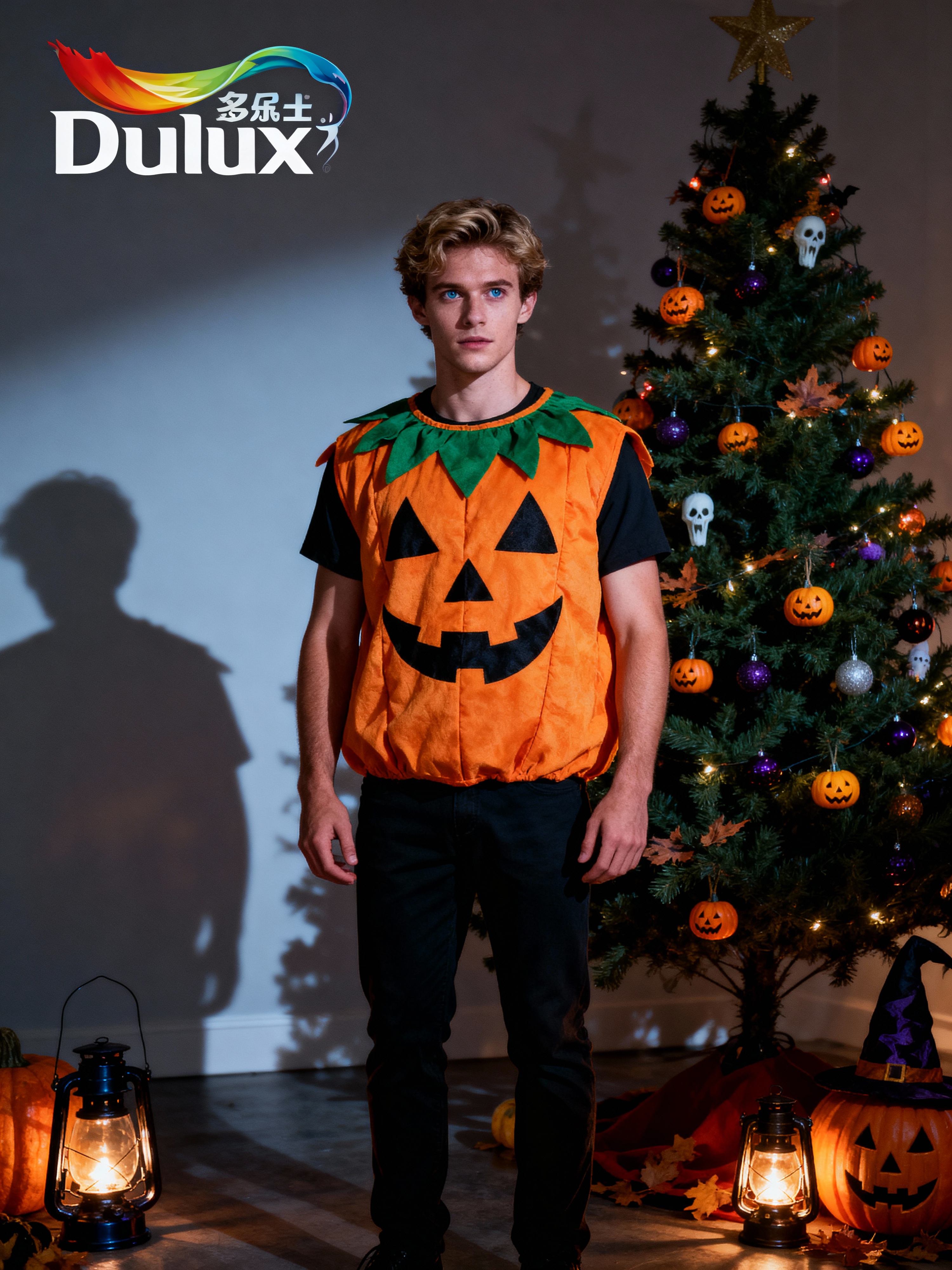 A model wearing a pumpkin-themed costume, standing beside a decorated Halloween tree and festive lanterns.