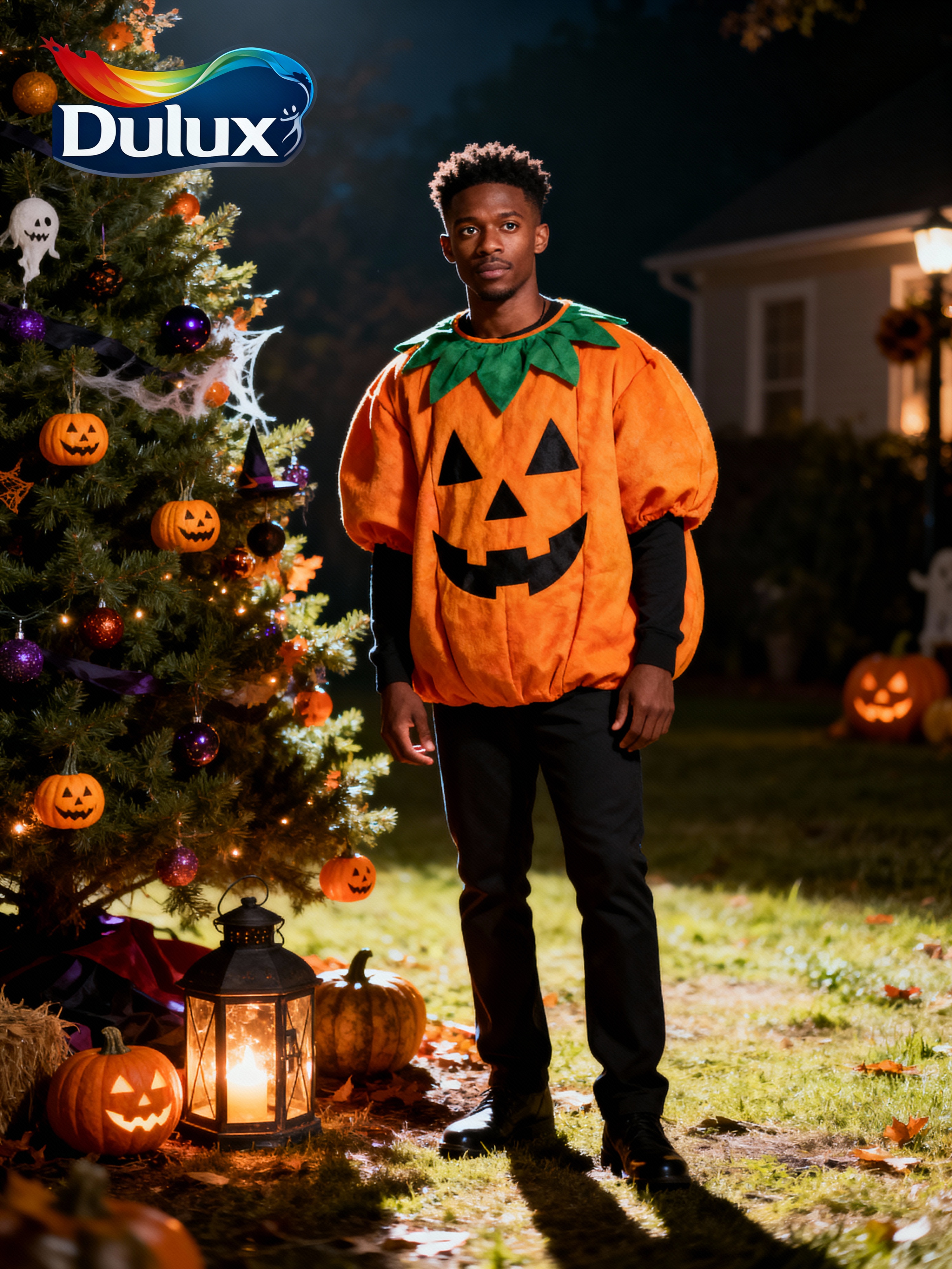 A model wearing a pumpkin-themed costume, standing beside a decorated Halloween tree and festive lanterns.