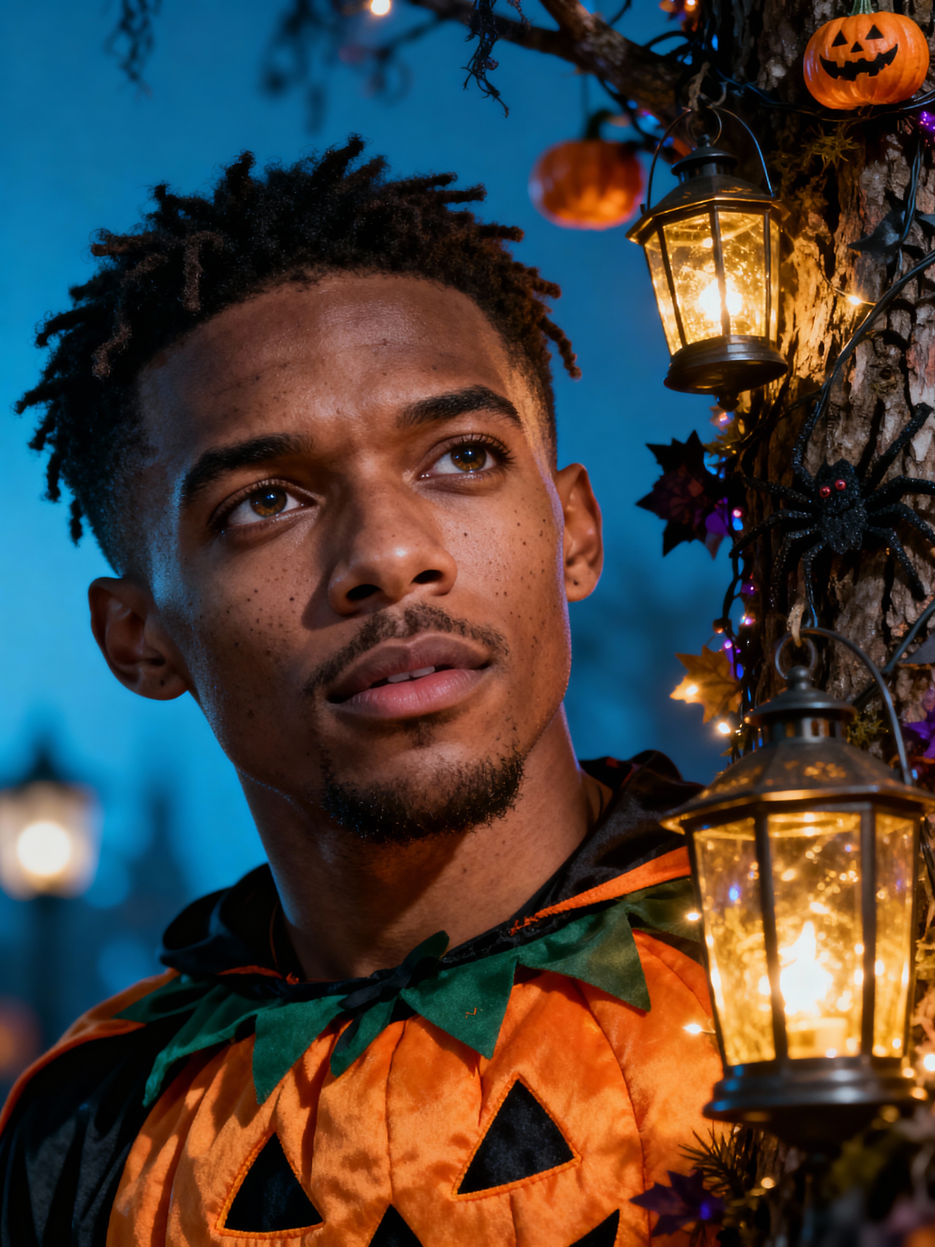 A model wearing a pumpkin-themed costume, standing beside a decorated Halloween tree and festive lanterns.