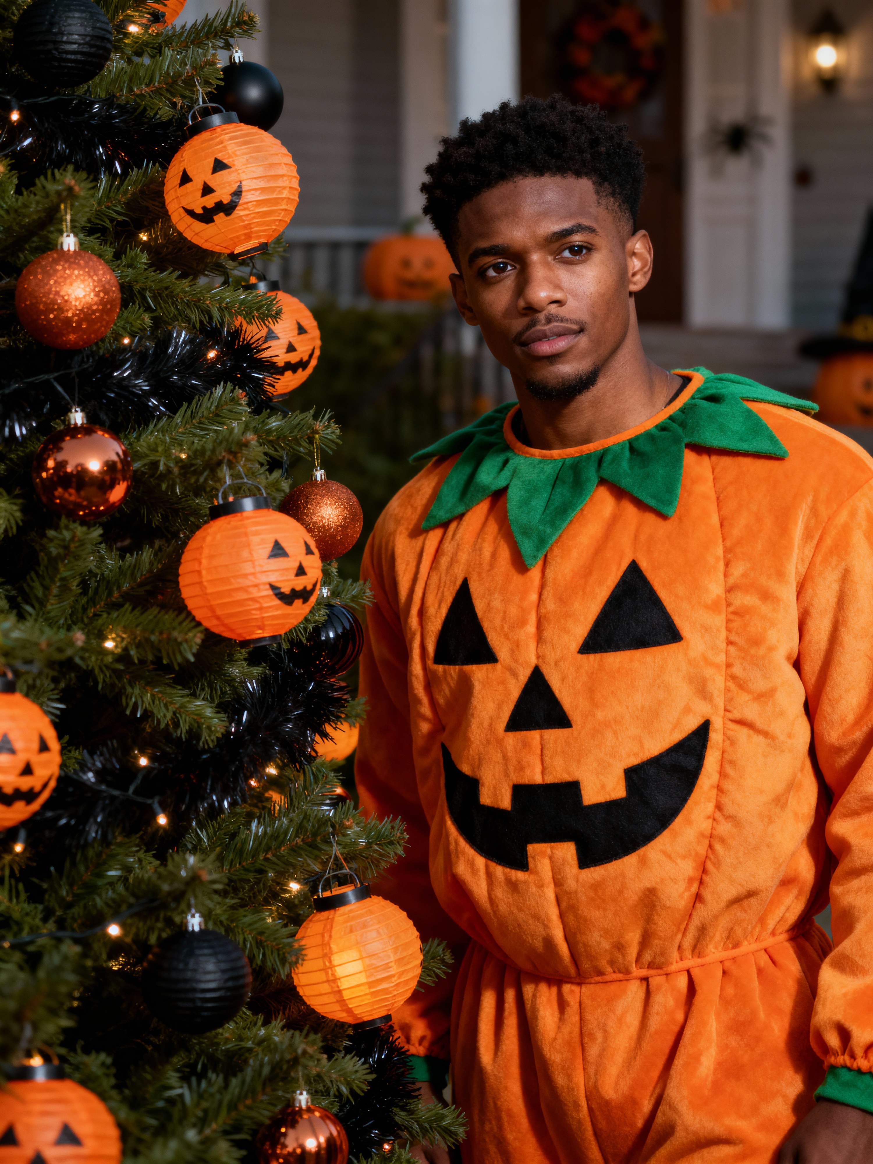 A model wearing a pumpkin-themed costume, standing beside a decorated Halloween tree and festive lanterns.