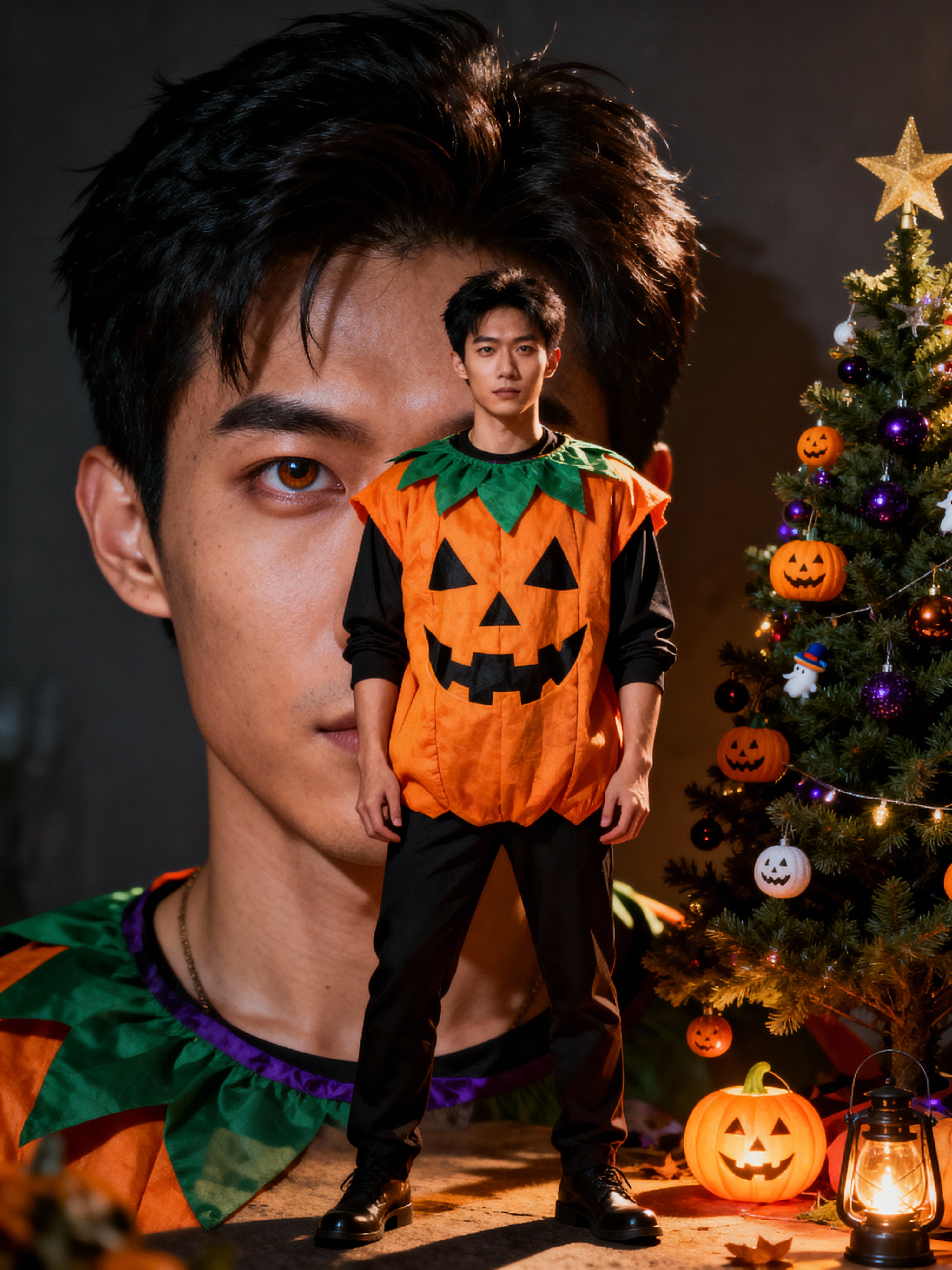A model wearing a pumpkin-themed costume, standing beside a decorated Halloween tree and festive lanterns.