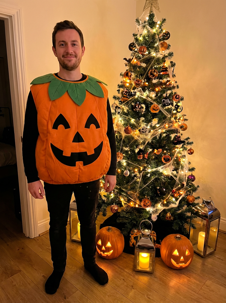 A model wearing a pumpkin-themed costume, standing beside a decorated Halloween tree and festive lanterns.