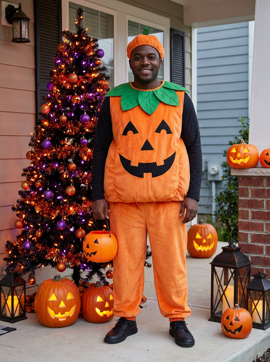 A model wearing a pumpkin-themed costume, standing beside a decorated Halloween tree and festive lanterns.