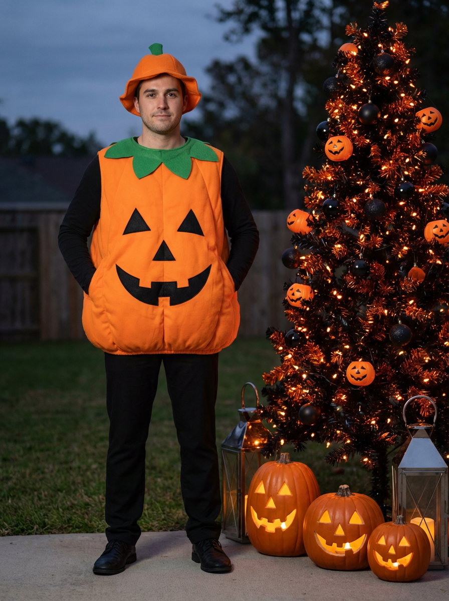A model wearing a pumpkin-themed costume, standing beside a decorated Halloween tree and festive lanterns.